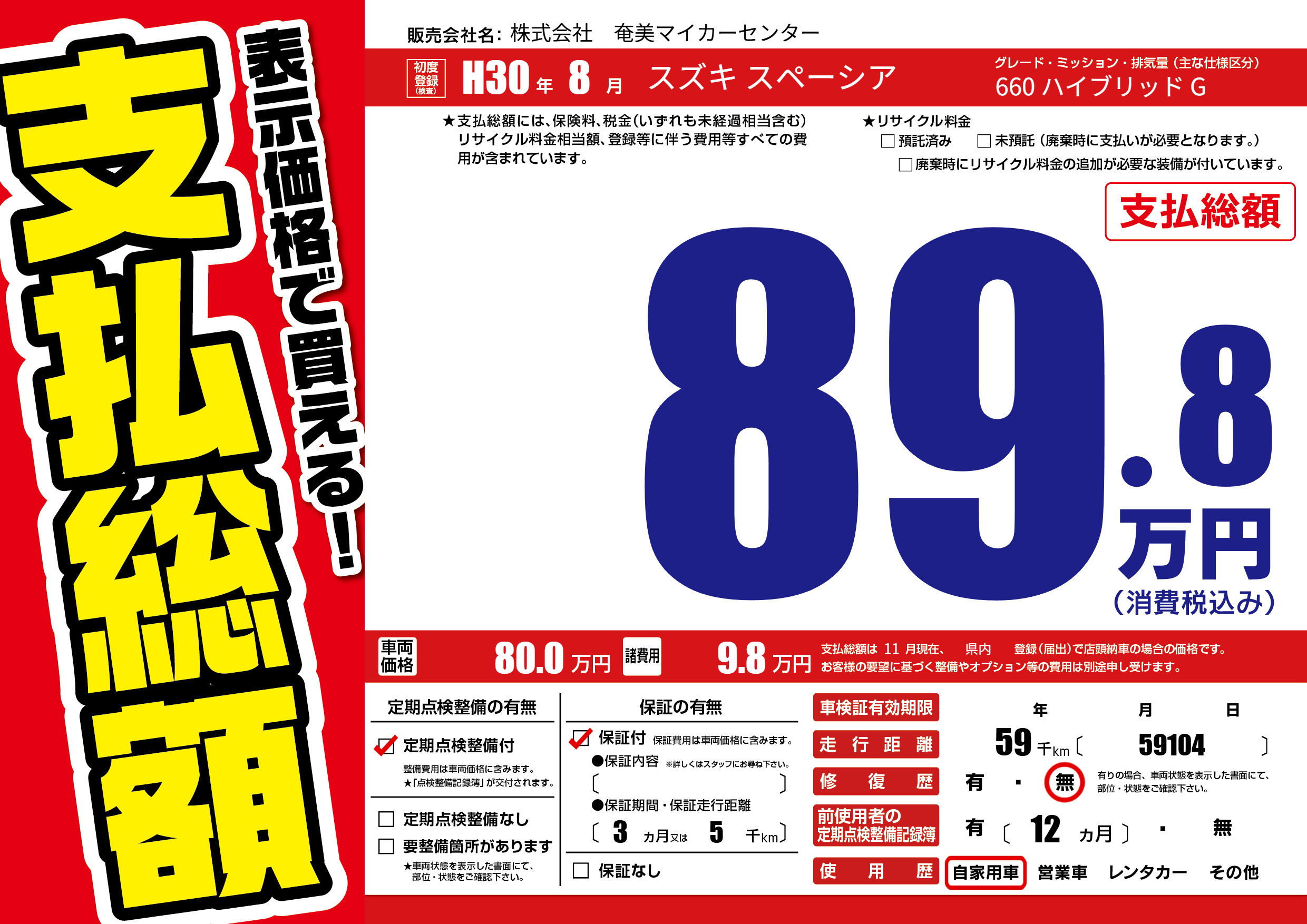 | 車名 | スズキ スペーシア | グレード ミッション 排気量 |