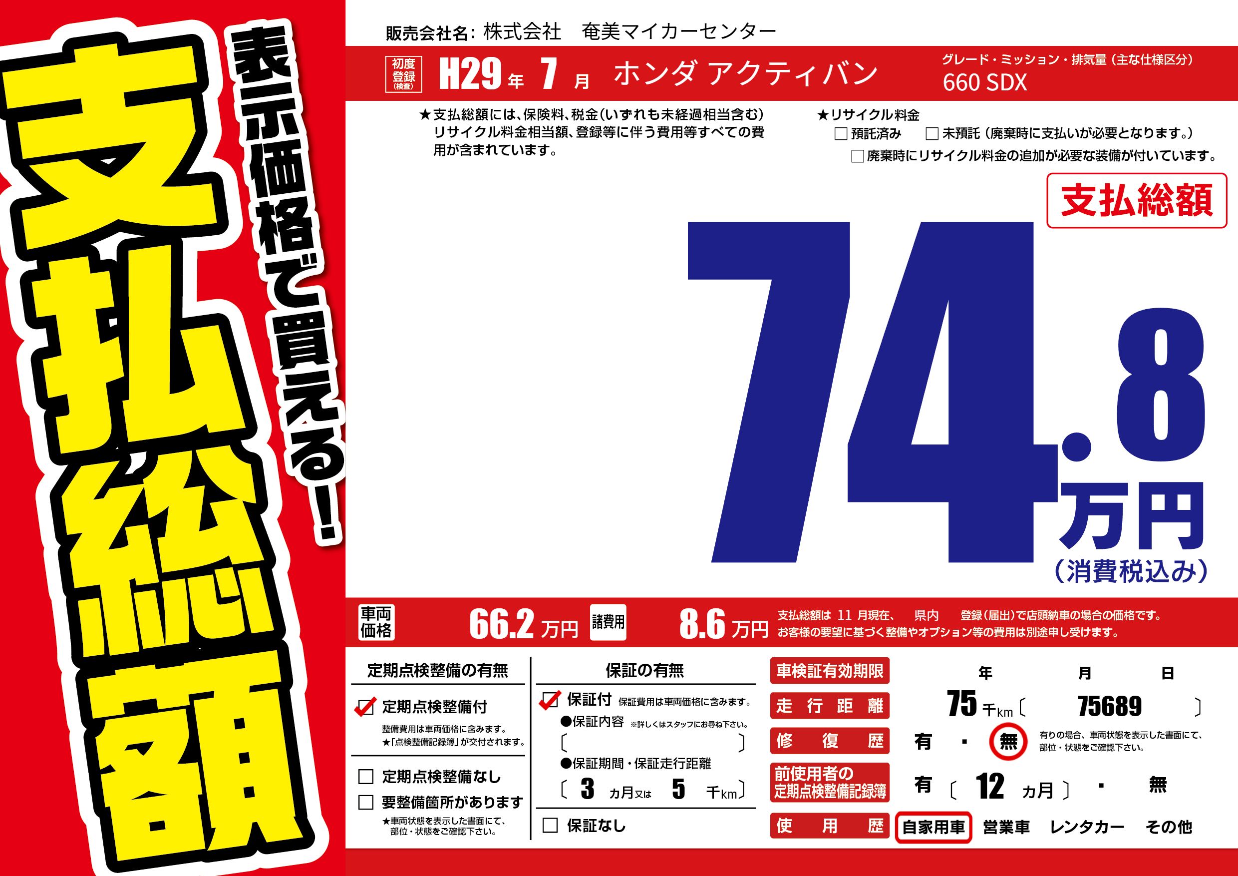 | 走行キロ | 7.5万km | 初年度登録 | H29年7月 |