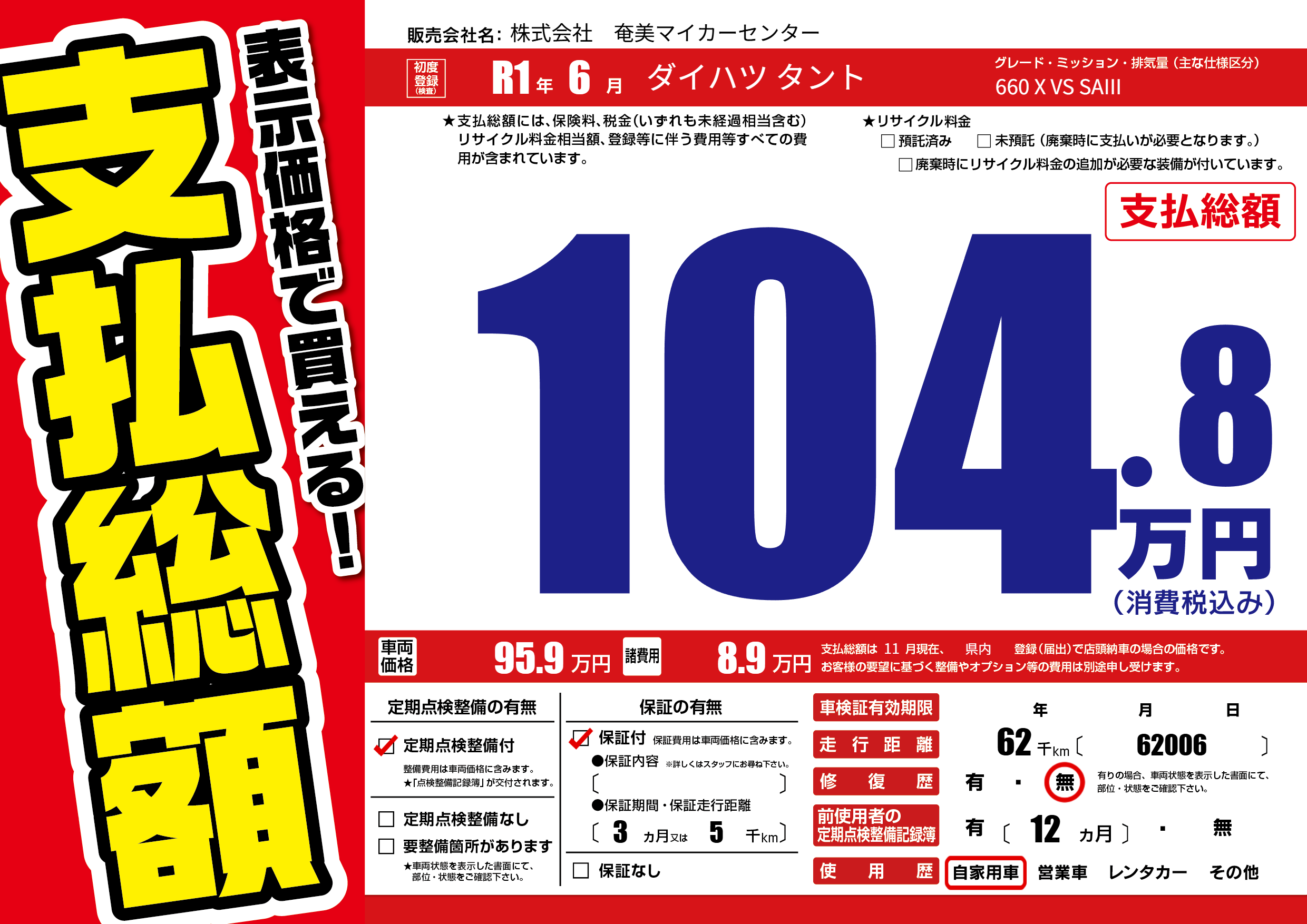 | 車名 | ダイハツ タント | グレード ミッション 排気量 |