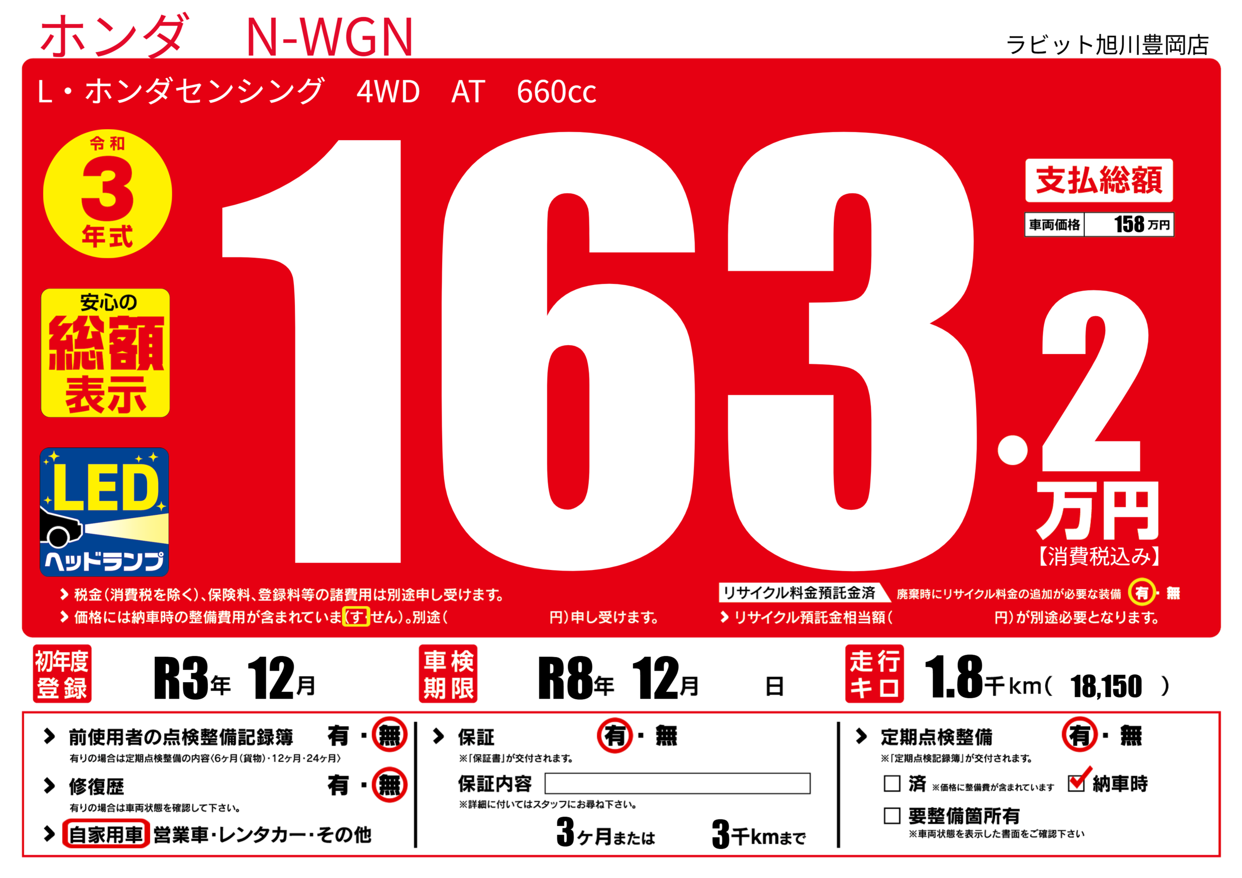 | 車名 | ホンダ N-WGN | グレード ミッション 排気量 |