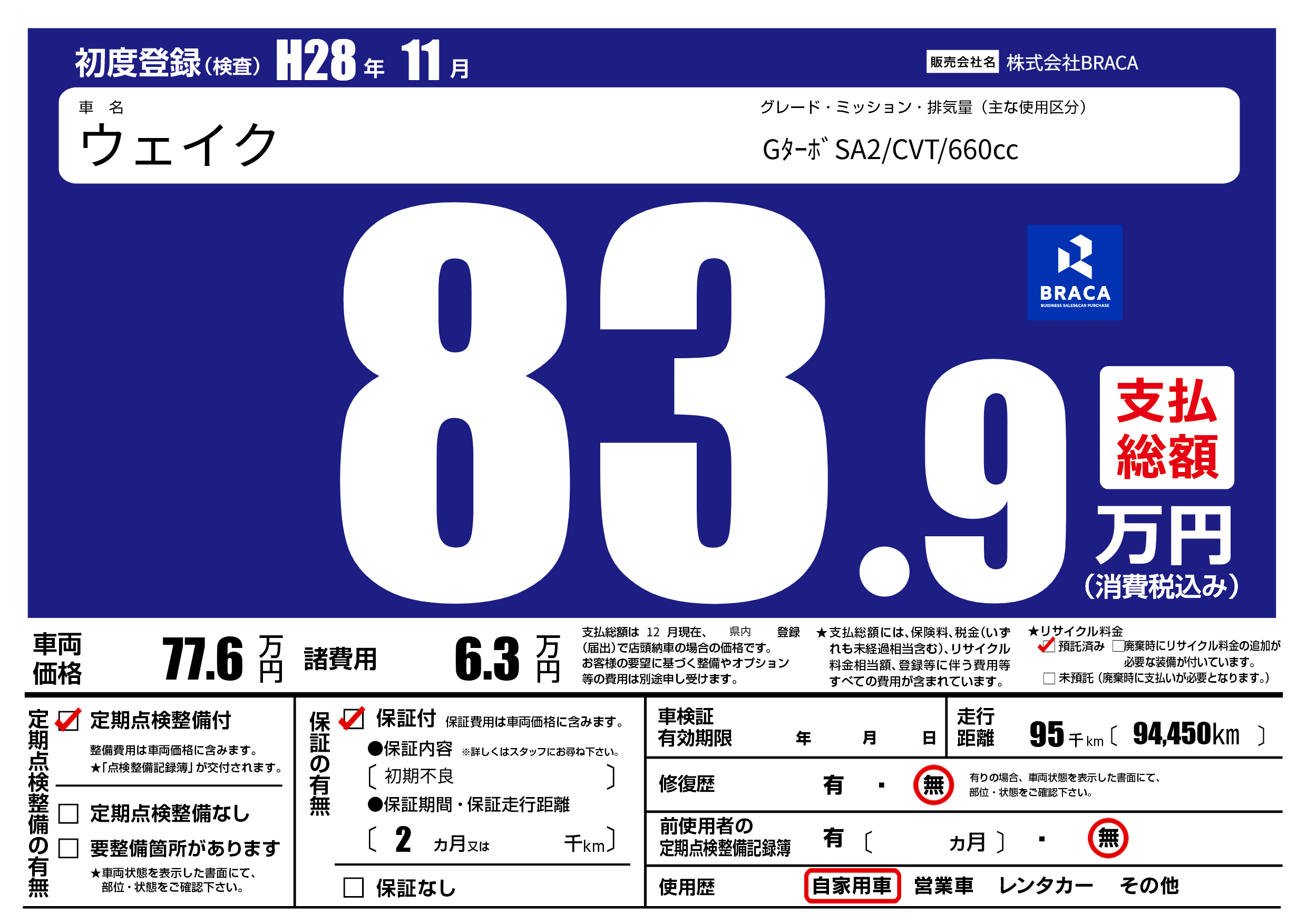 保証付き 保証内容(初期不良) 2ヶ月または()千kmまで |