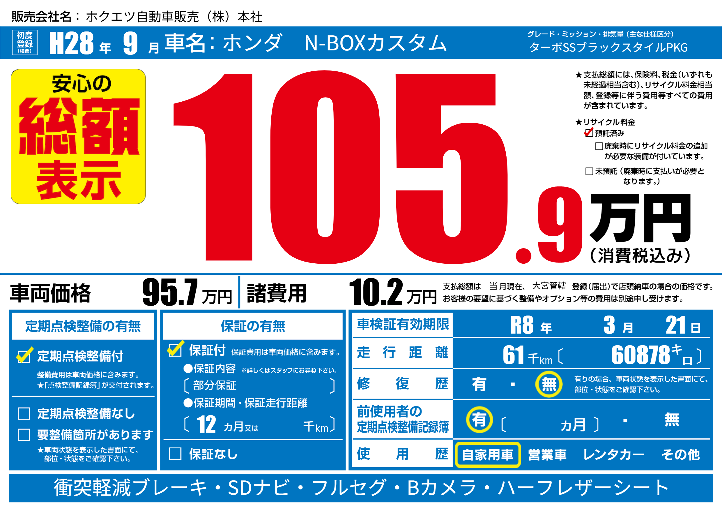 | 走行キロ | 6.1万km | 初年度登録 | H28年9月 |