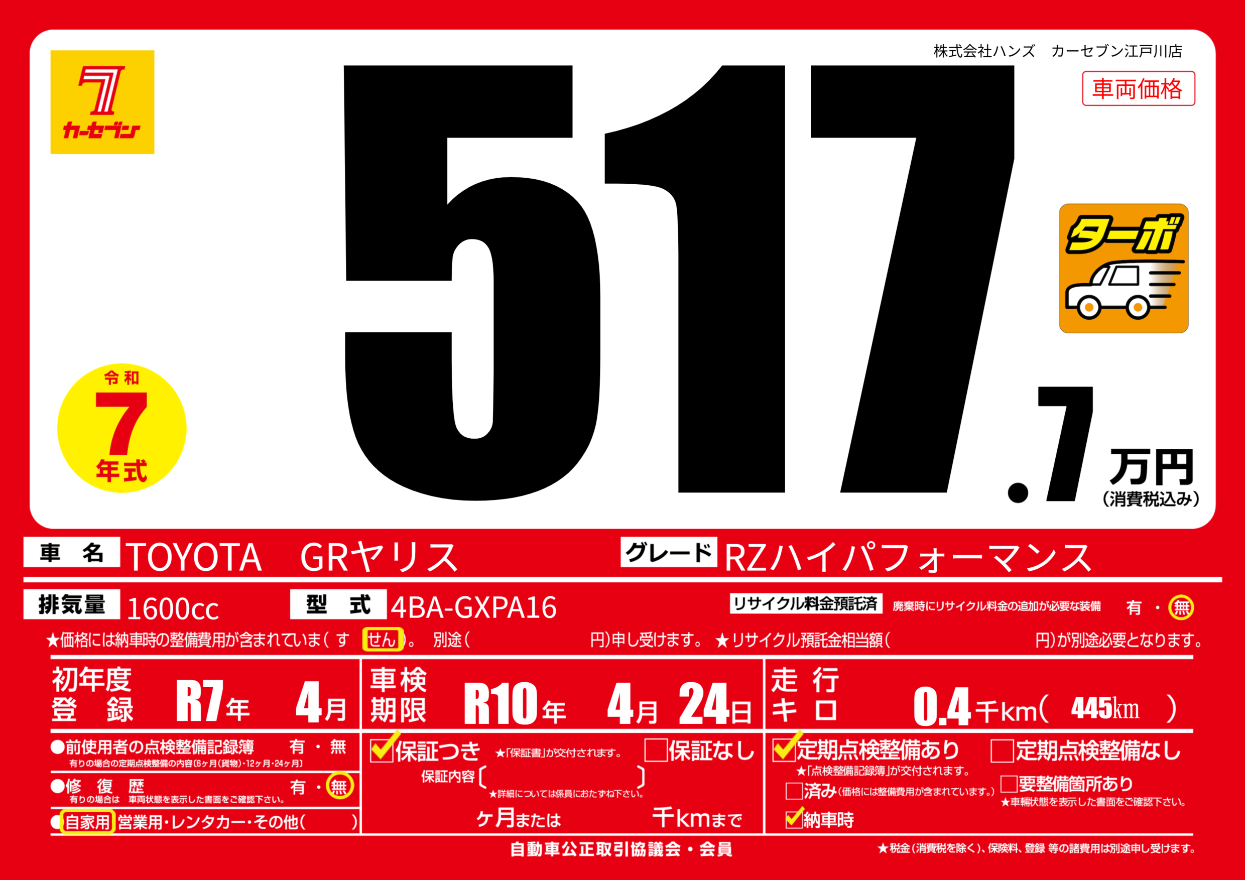 | 車名 | TOYOTA GRヤリス | グレード ミッション 排気量 |