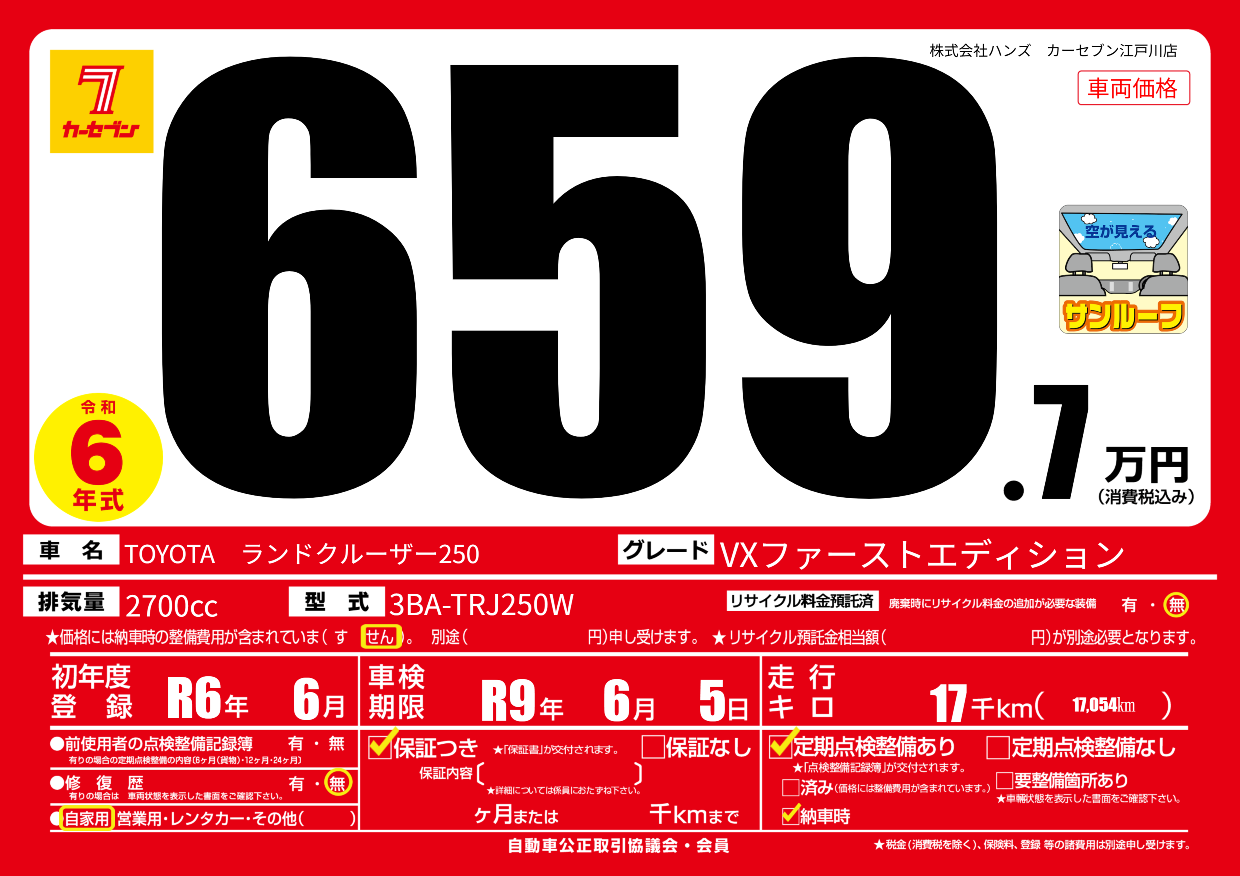 | 車名 | TOYOTA ランドクルーザー250 | グレード ミッション 排気量 |