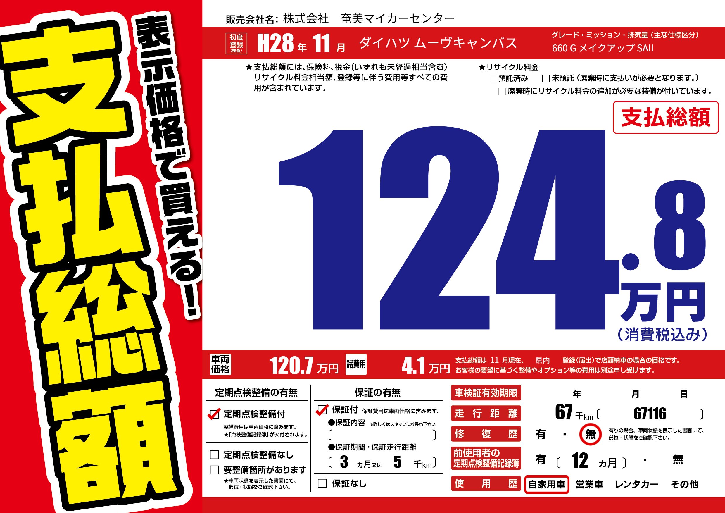 | 走行キロ | 6.7万km | 初年度登録 | H28年11月 |