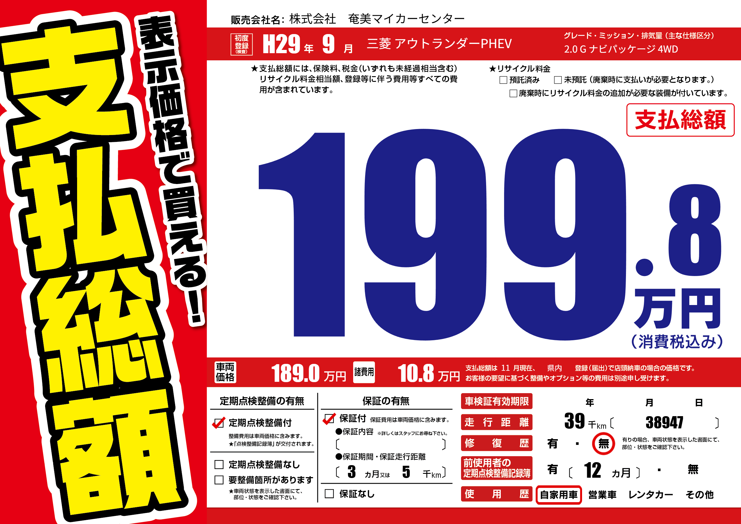 | 車名 | 三菱 アウトランダーPHEV | グレード ミッション 排気量 |