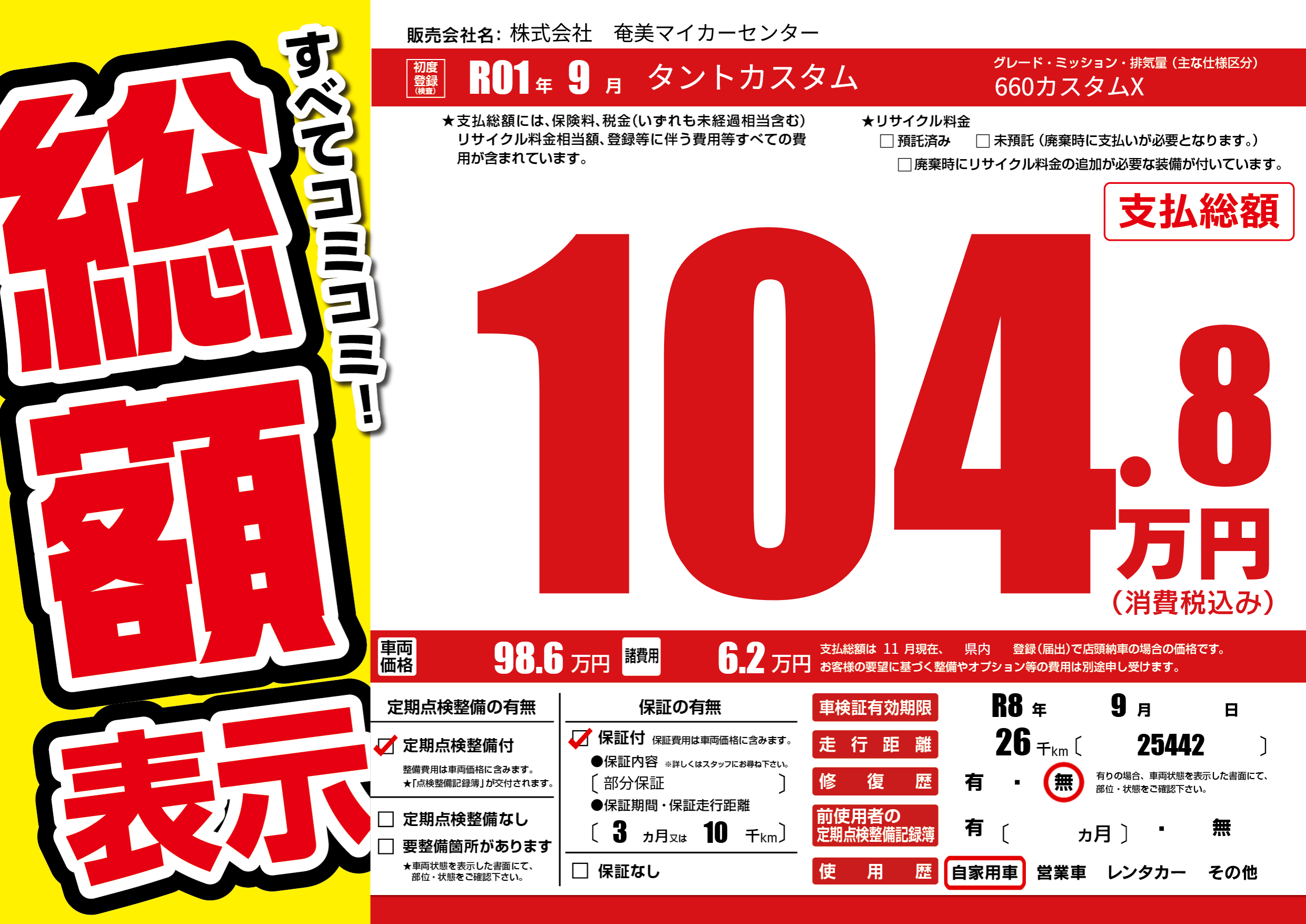 | 走行キロ | 2.6万km | 初年度登録 | R01年9月 |
