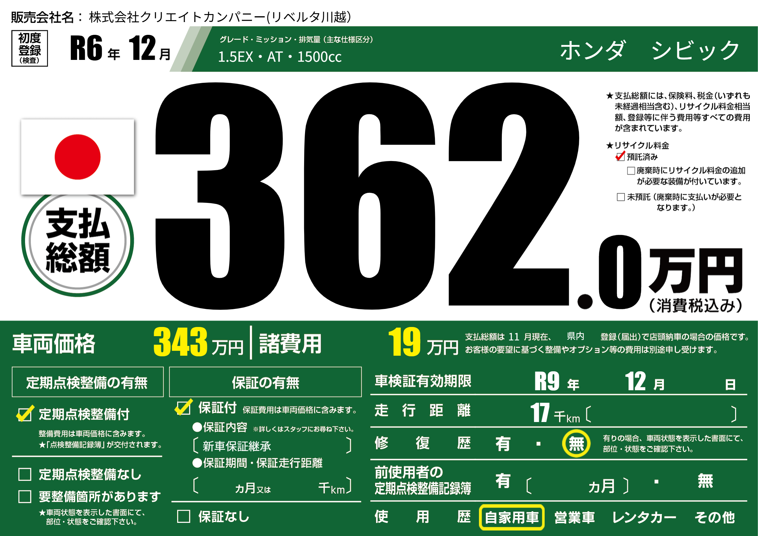 | 車名 | ホンダ シビック | グレード ミッション 排気量 |