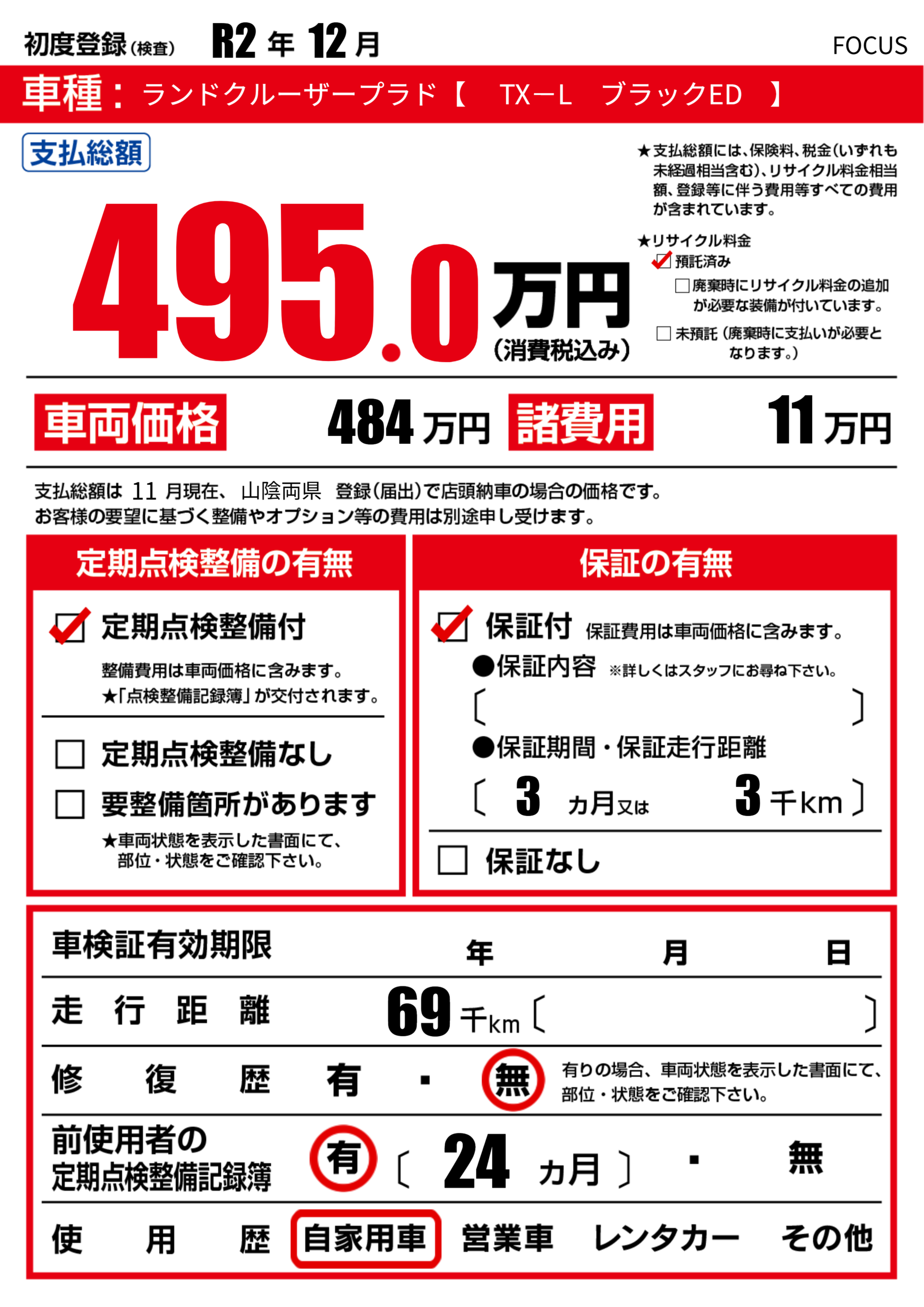 | 車名 | ランドクルーザープラド【 TX-L ブラックED 】 | グレード ミッション 排気量 |