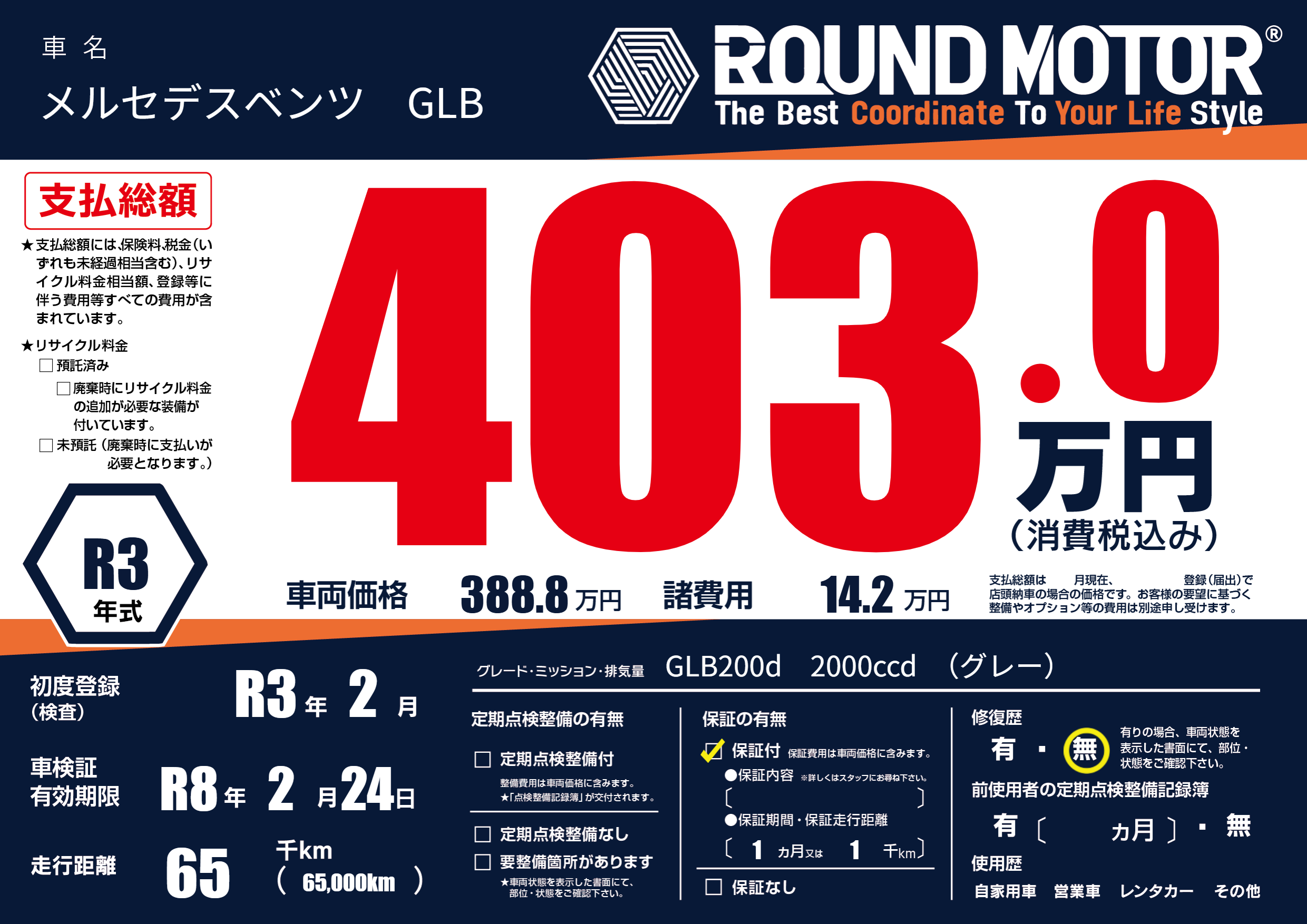 | 車名 | メルセデスベンツ GLB | グレード ミッション 排気量 |