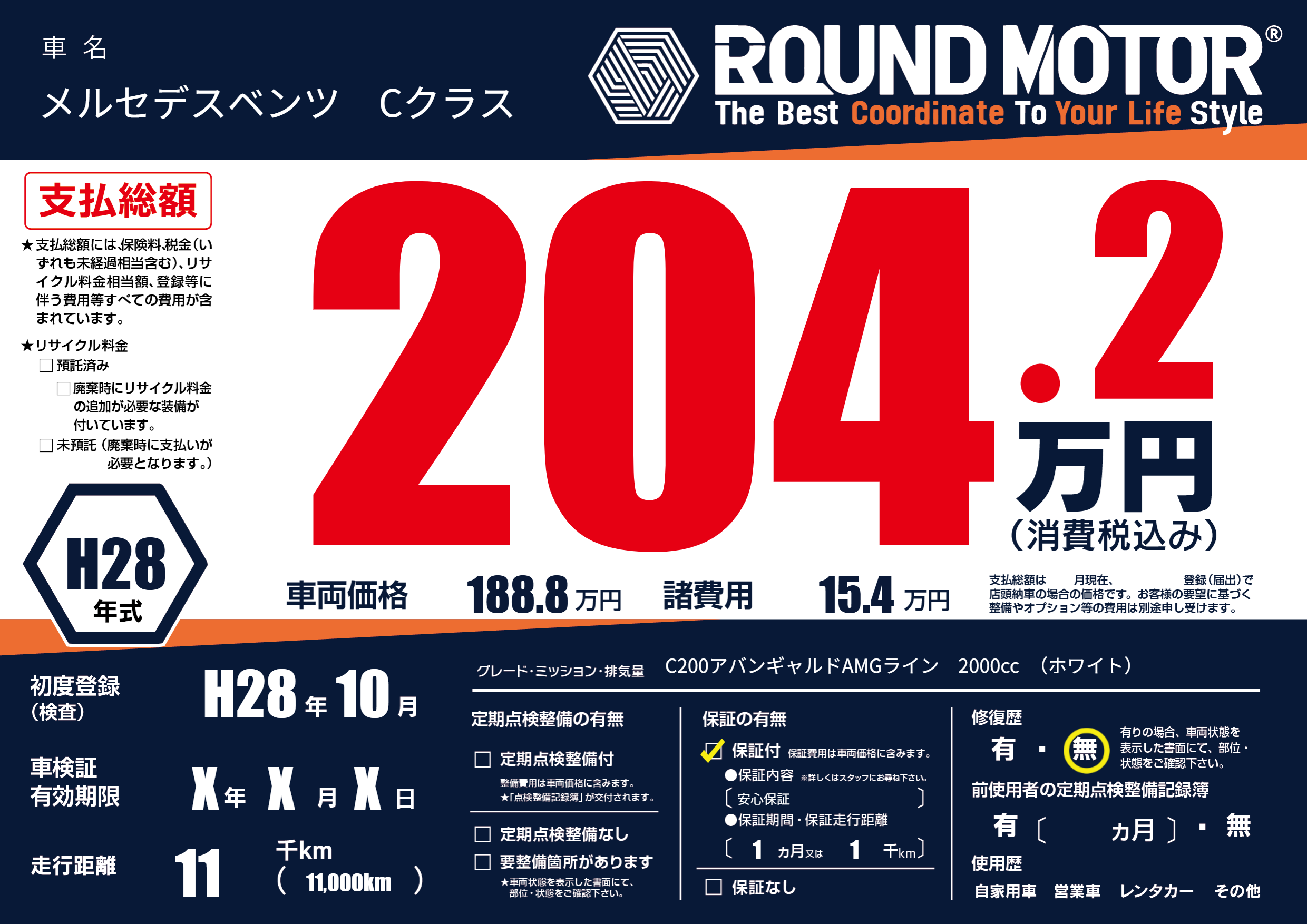 | 車名 | メルセデスベンツ Cクラス | グレード ミッション 排気量 |