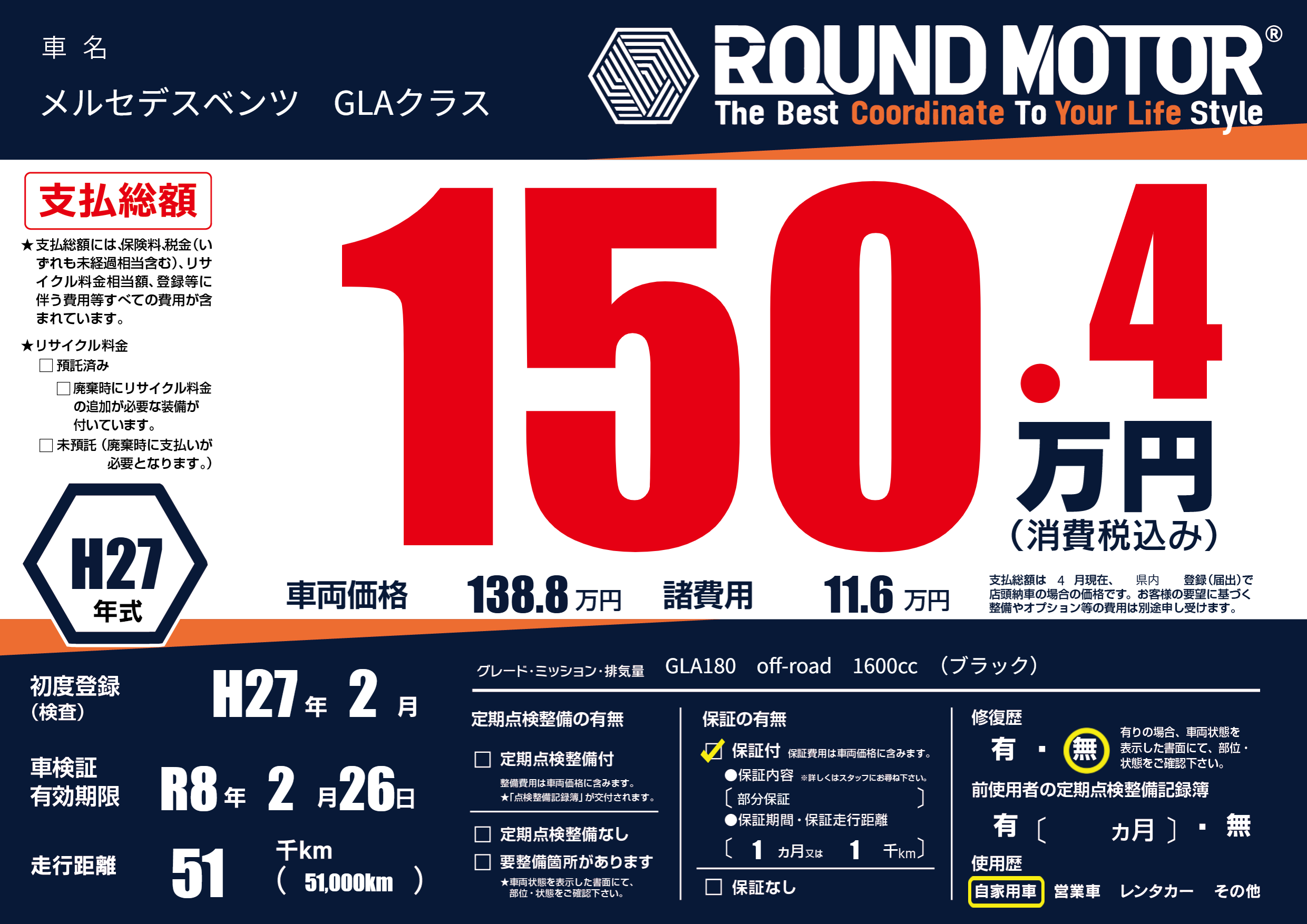 | 車名 | メルセデスベンツ GLAクラス | グレード ミッション 排気量 |