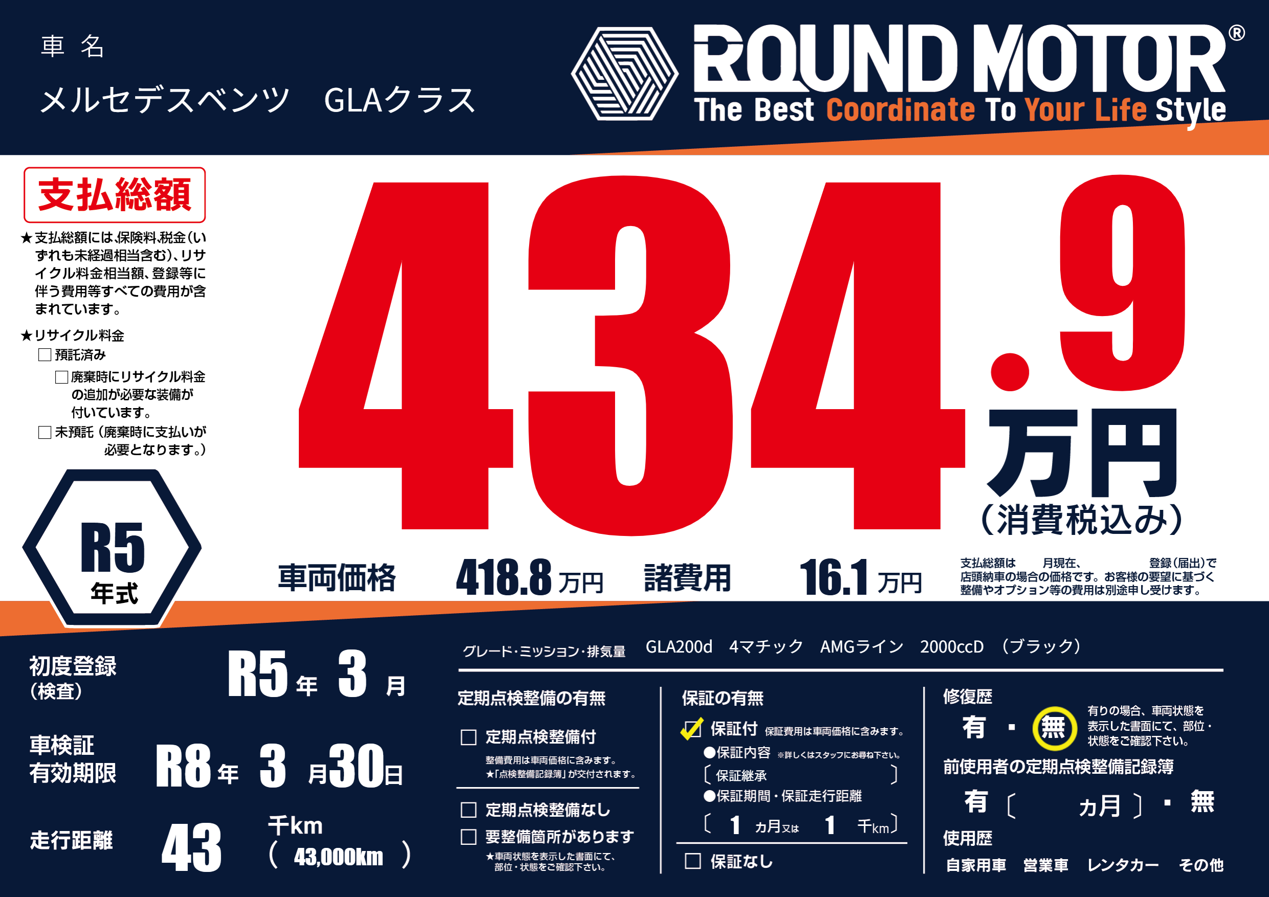 | 車名 | メルセデスベンツ GLAクラス | グレード ミッション 排気量 |