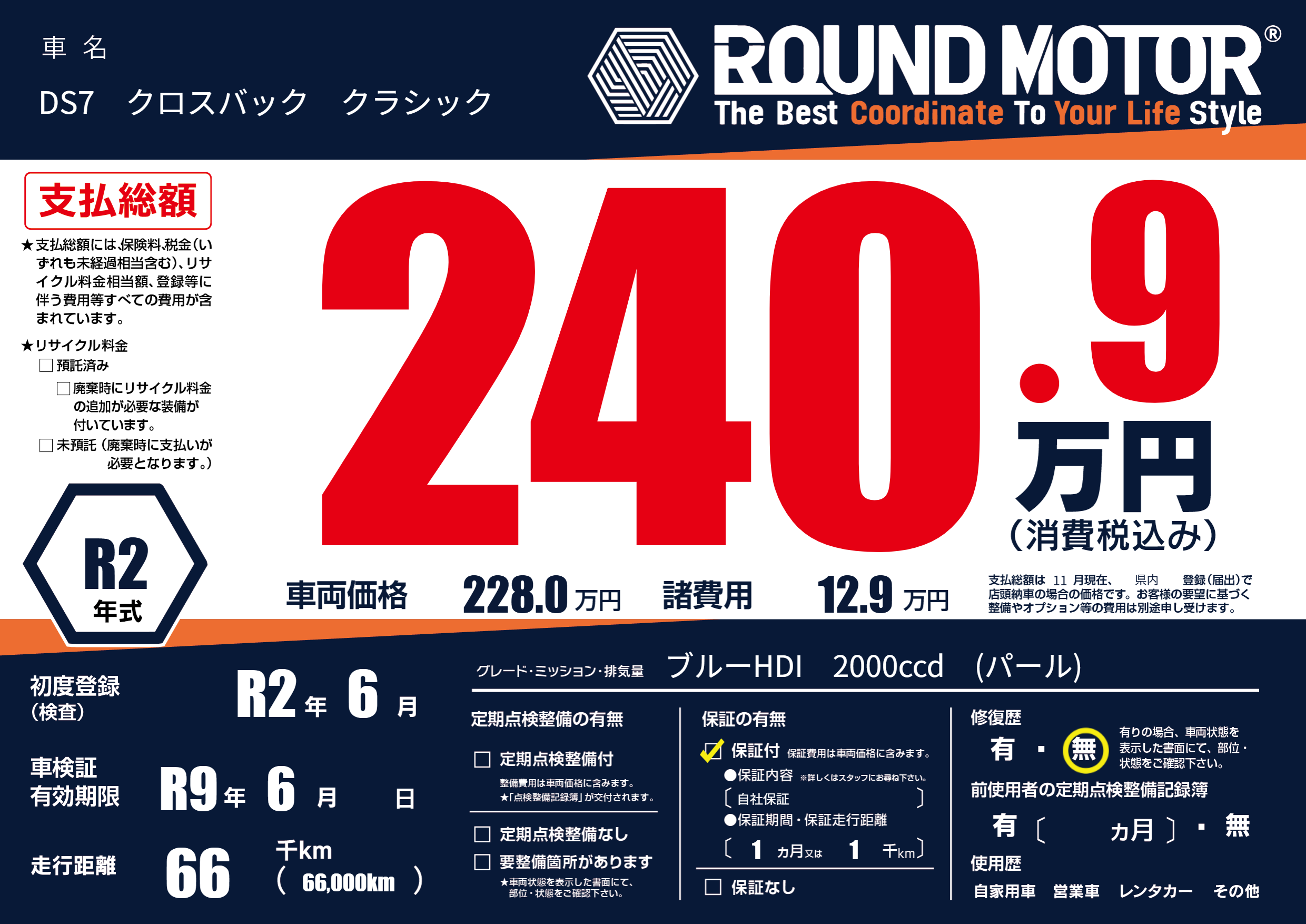 | 車検制限 | R9年 6月 - 日 | ||