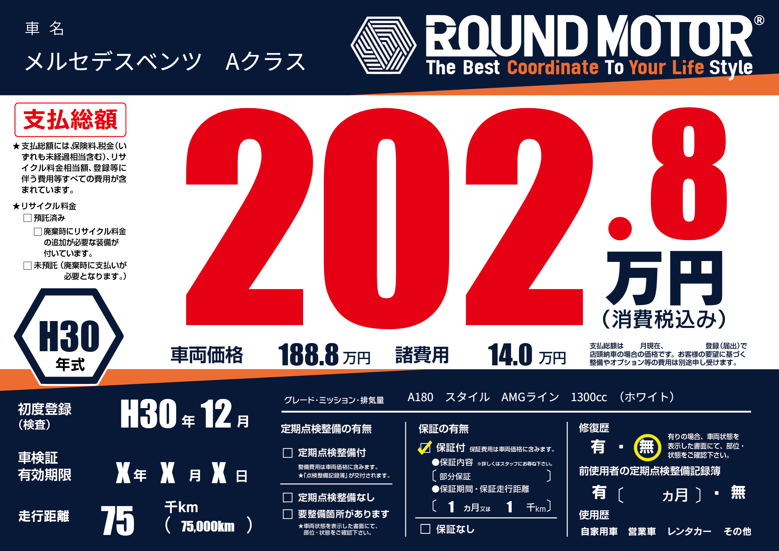 | 車名 | メルセデスベンツ Aクラス | グレード ミッション 排気量 |