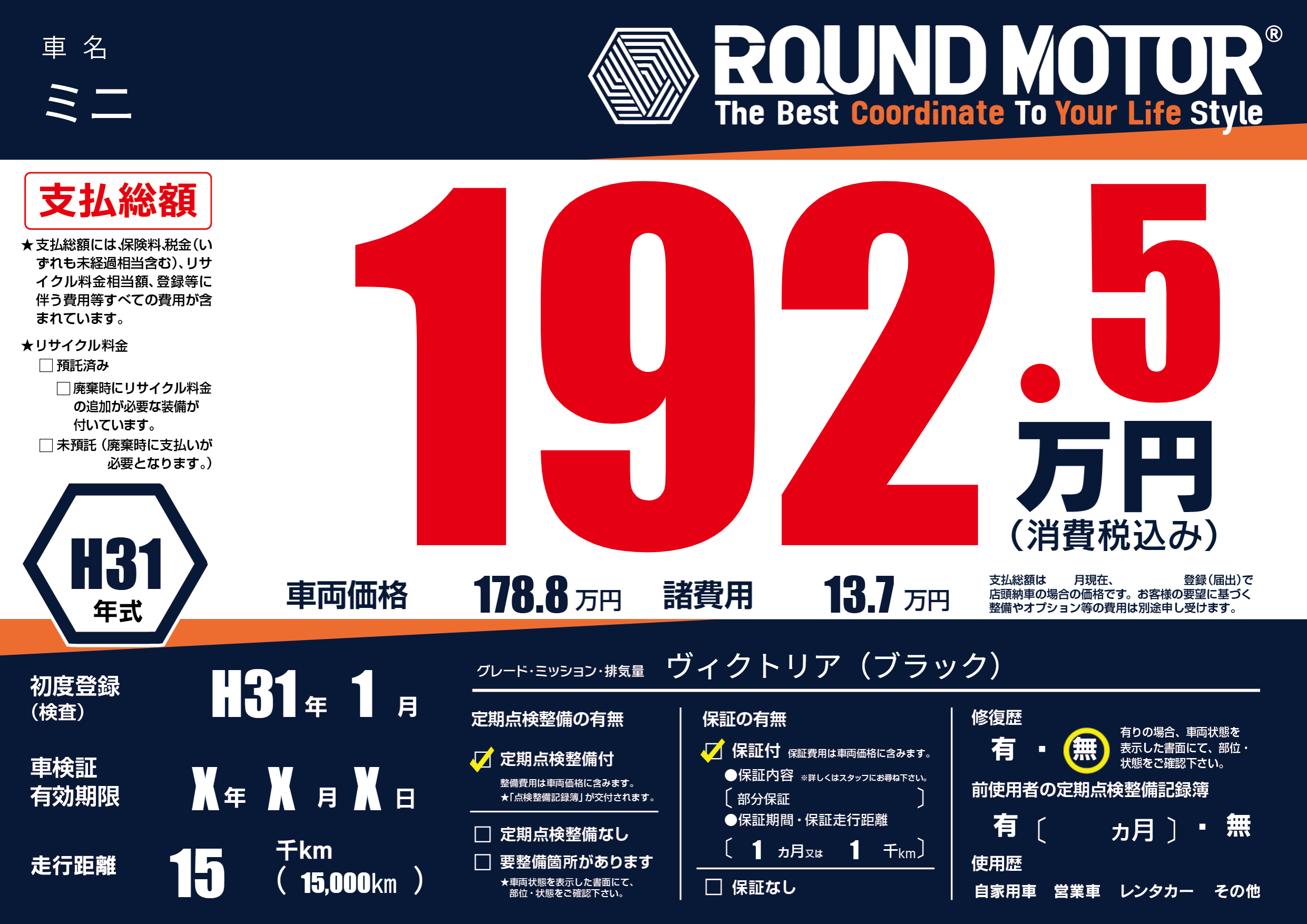 | 車名 | ミニ | グレード ミッション 排気量 |