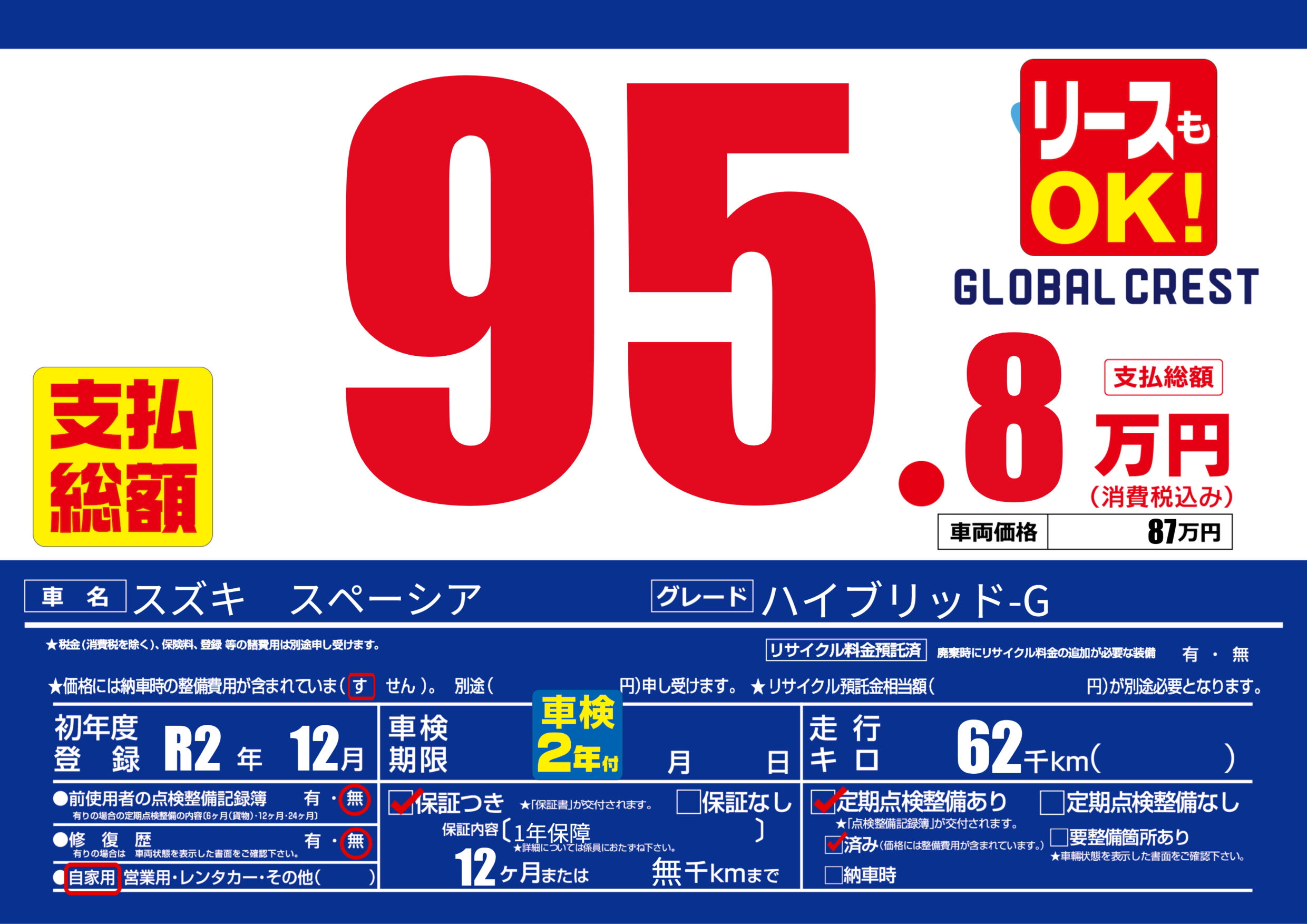 | 定期点検整備 | 定期点検整備あり 定期点検整備済み | ||