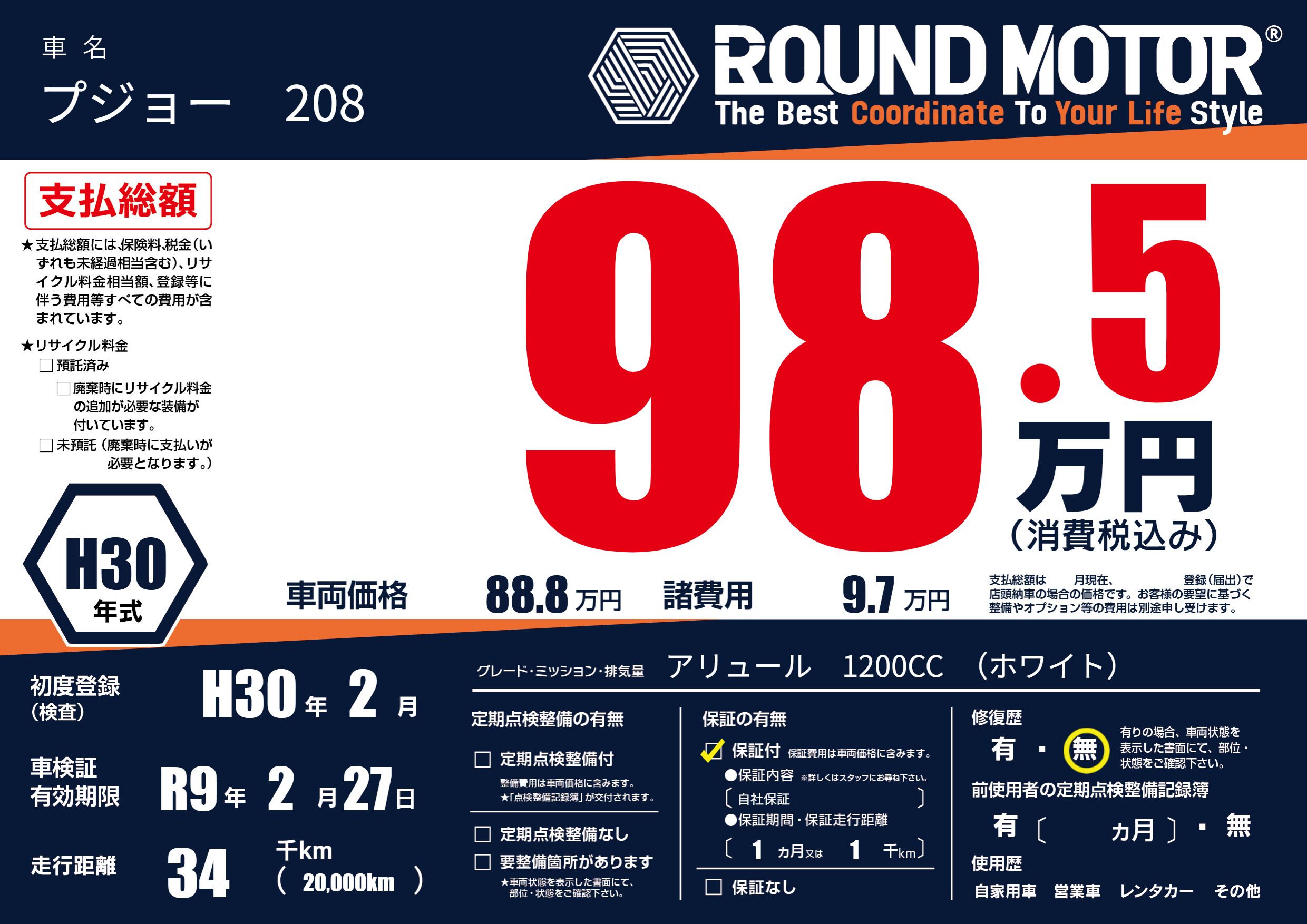 | 車名 | プジョー 208 | グレード ミッション 排気量 |