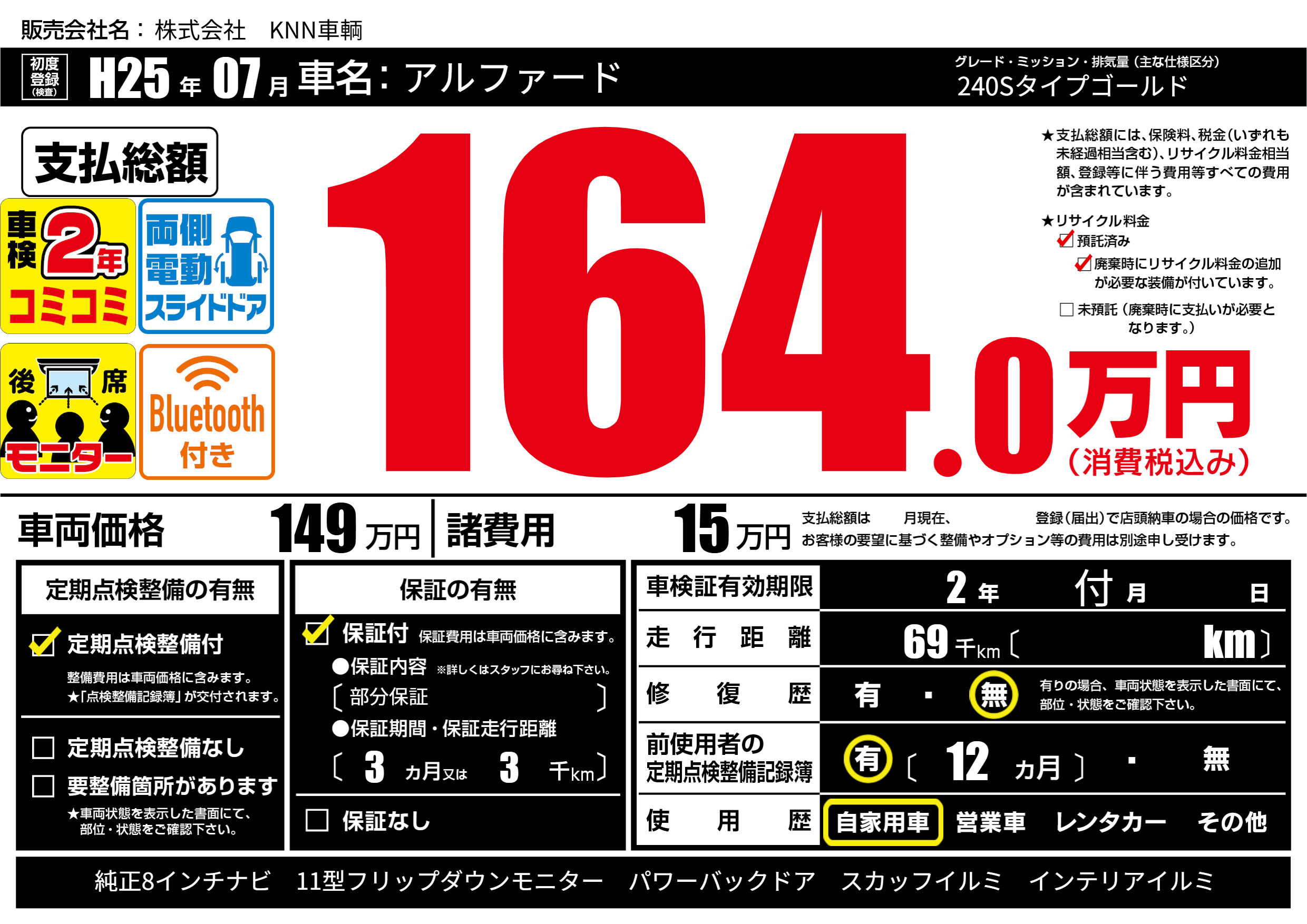 | 走行キロ | 6.9万km | 初年度登録 | H25年07月 |