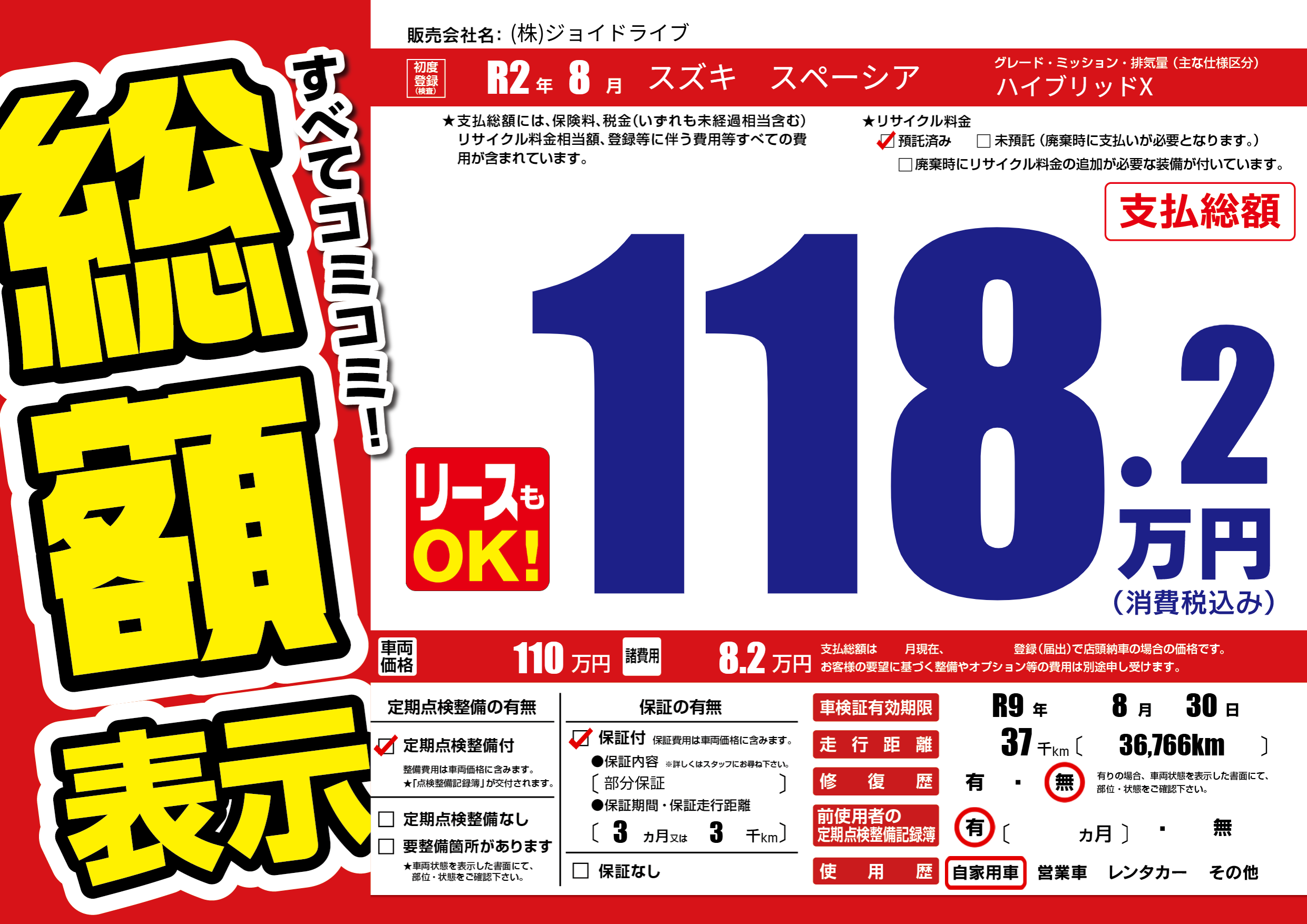 | 走行キロ | 3.7万km | 初年度登録 | R2年8月 |