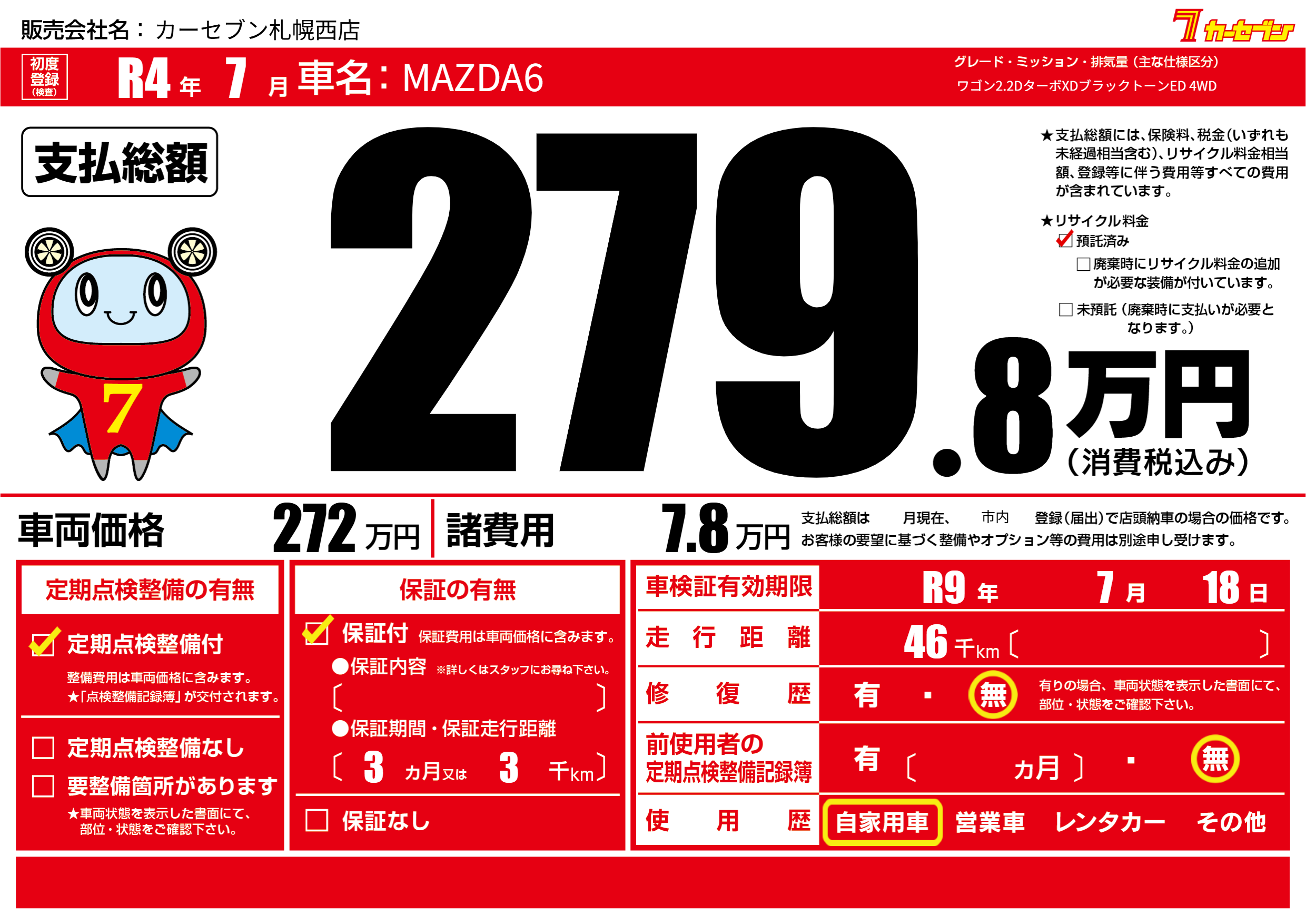 | 車名 | MAZDA6 | グレード ミッション 排気量 |