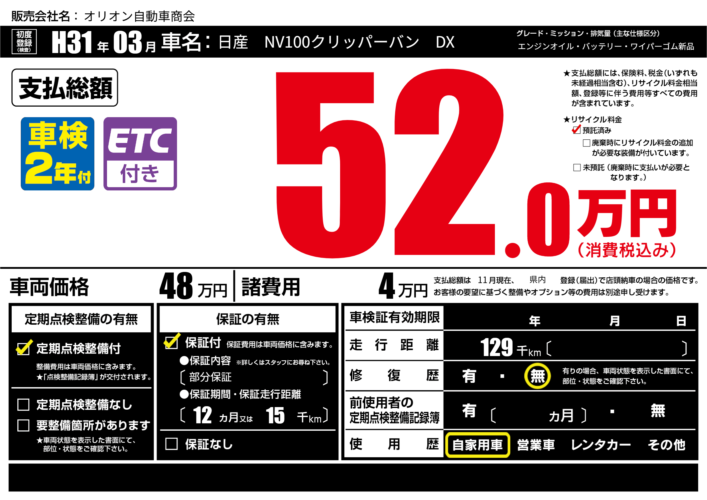 | 車名 | 日産 NV100クリッパーバン DX | グレード ミッション 排気量 |