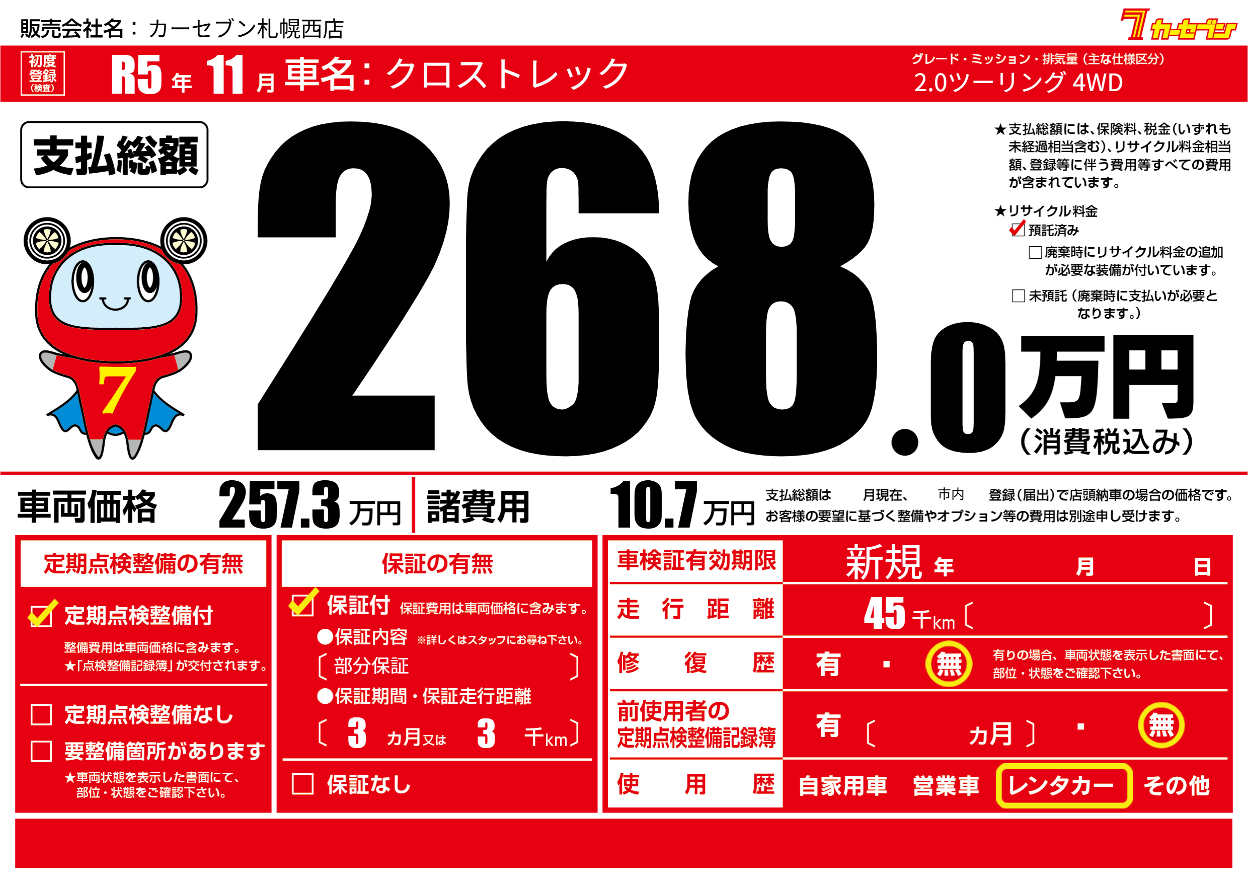 | 走行キロ | 4.5万km | 初年度登録 | R5年11月 |