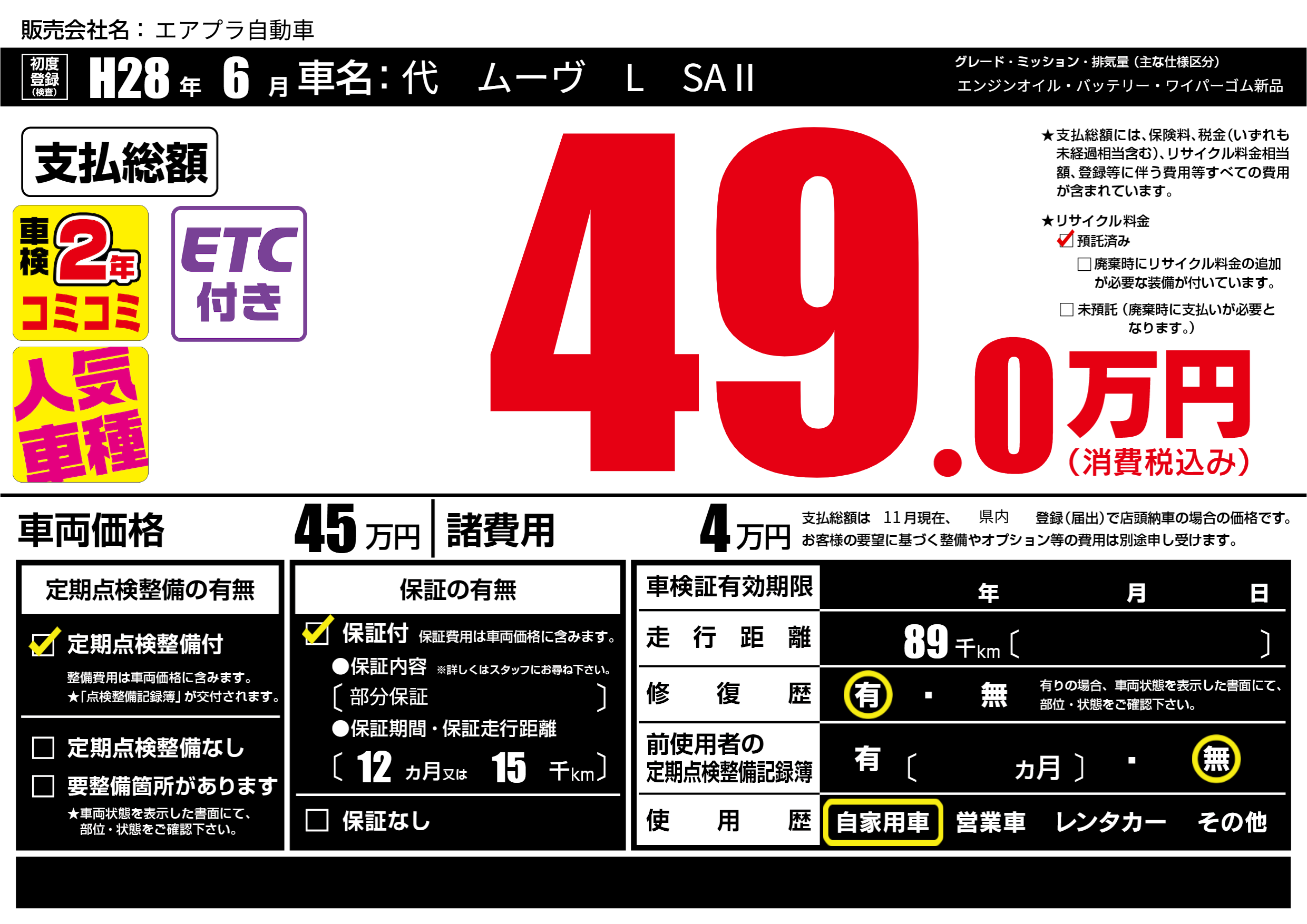 | 定期点検整備 | 定期点検整備あり | ||