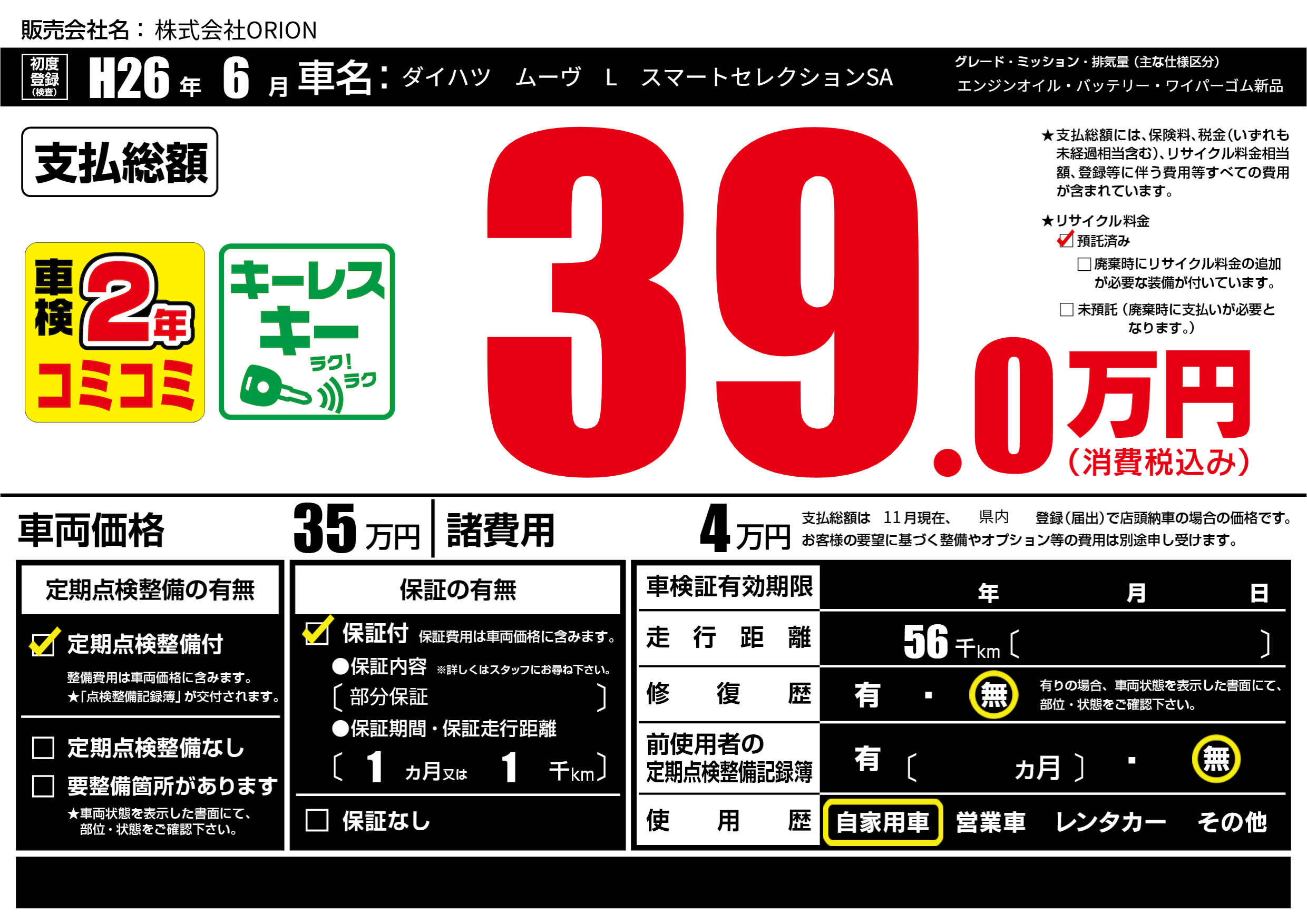 | 走行キロ | 5.6万km | 初年度登録 | H26年6月 |