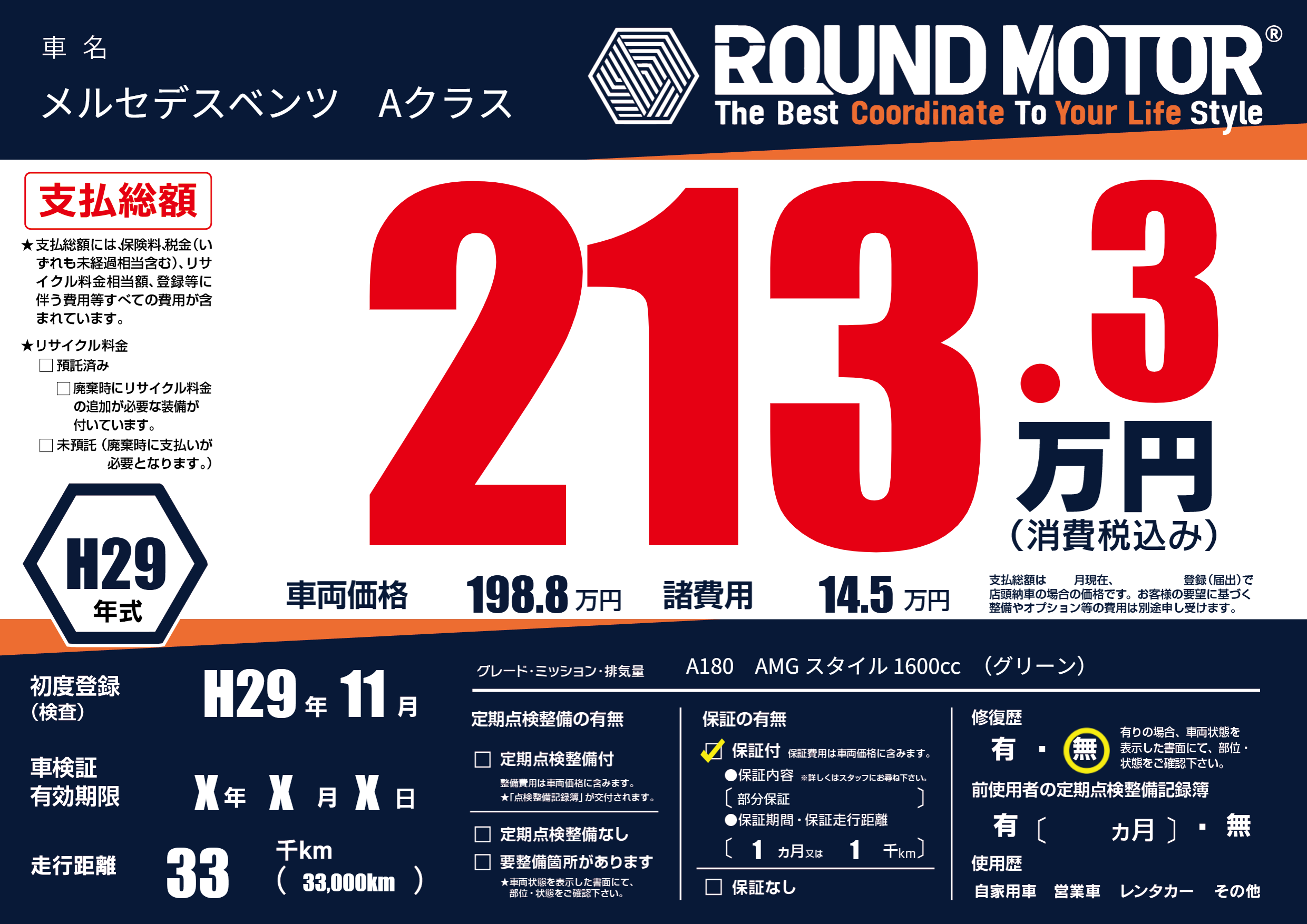 | 車名 | メルセデスベンツ Aクラス | グレード ミッション 排気量 |