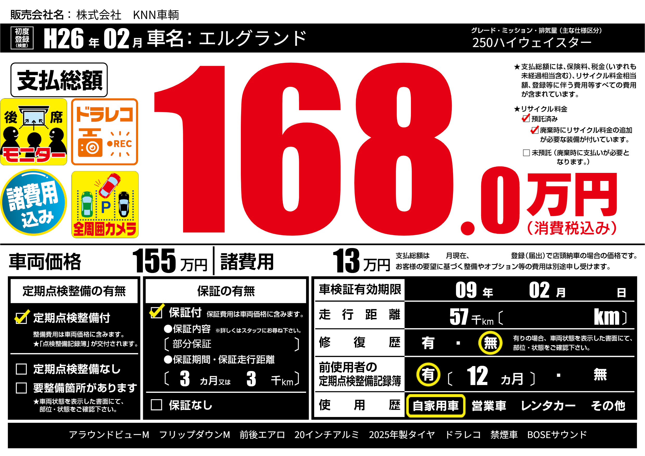 | 車名 | エルグランド | グレード ミッション 排気量 |