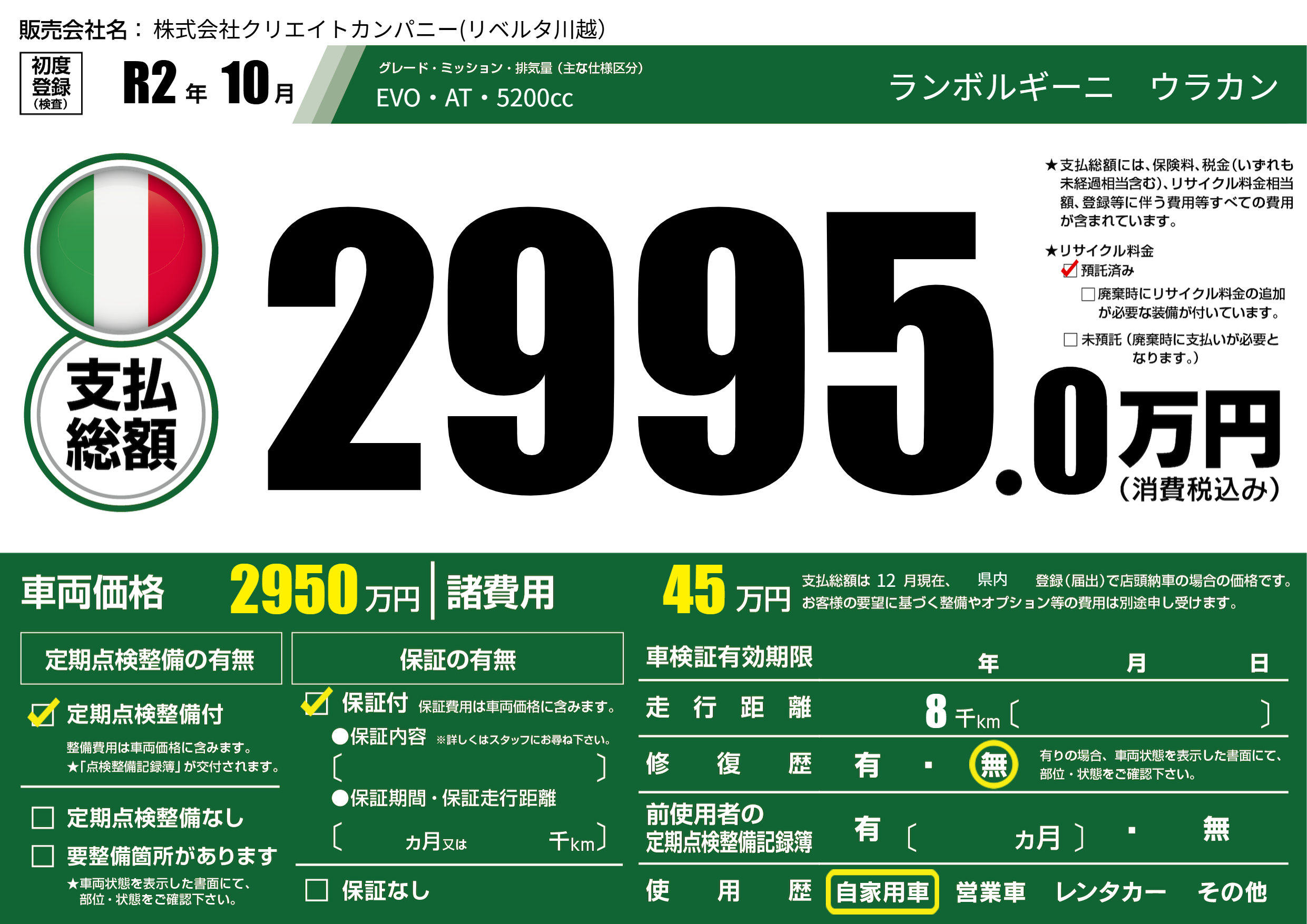 | 車名 | ランボルギーニ ウラカン | グレード ミッション 排気量 |