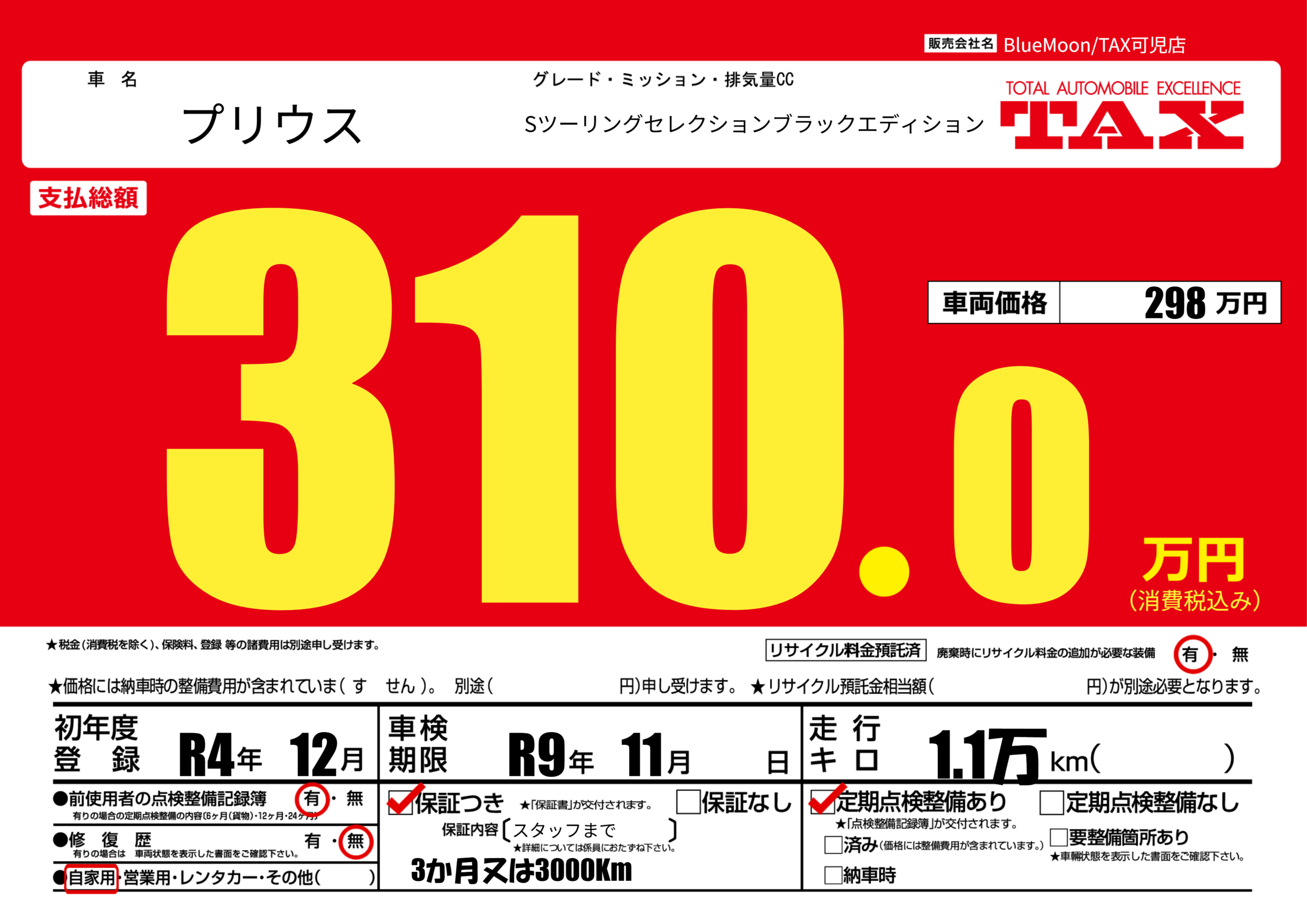 | 車名 | プリウス | グレード ミッション 排気量 |