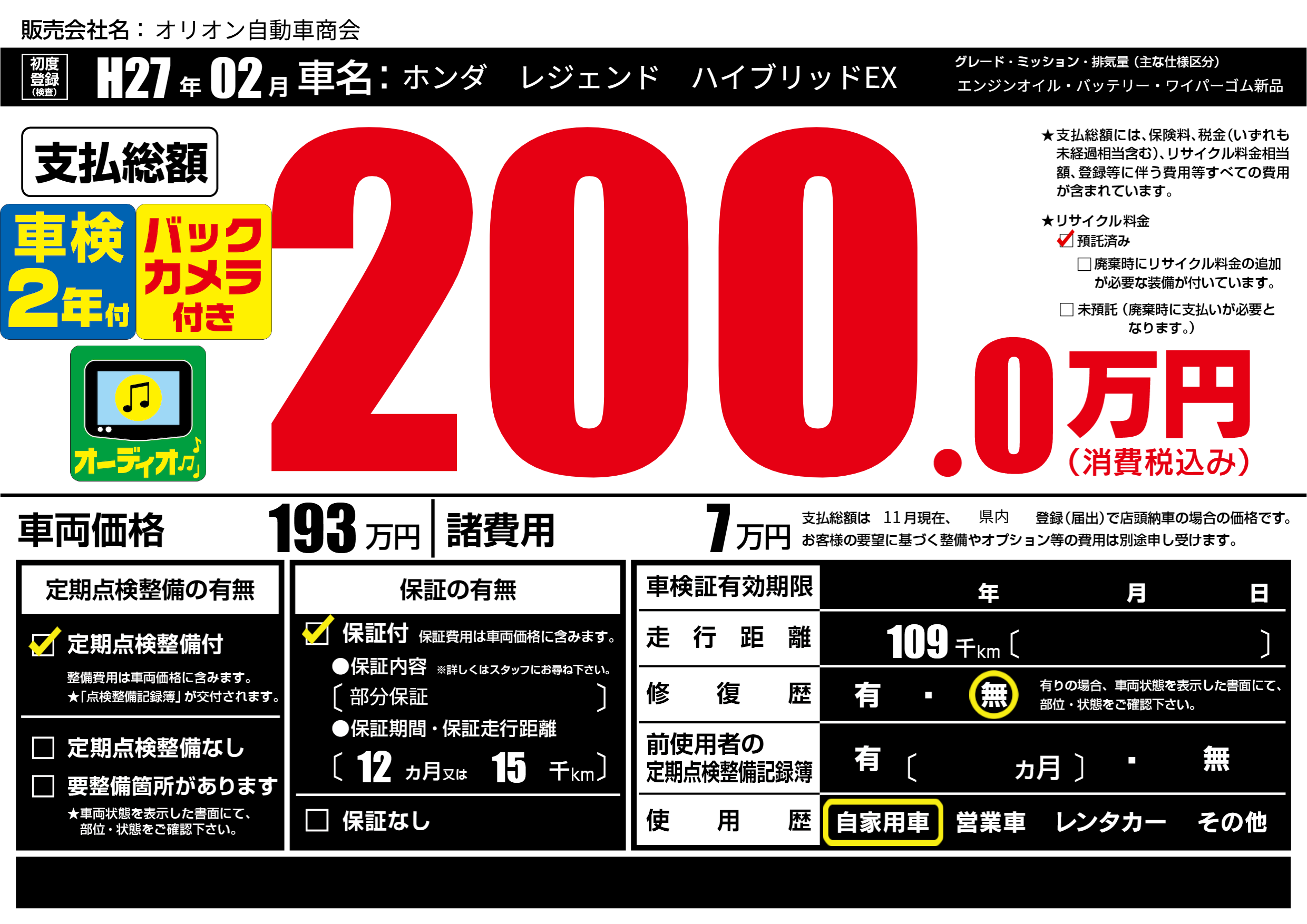 | 車名 | ホンダ レジェンド ハイブリッドEX | グレード ミッション 排気量 |