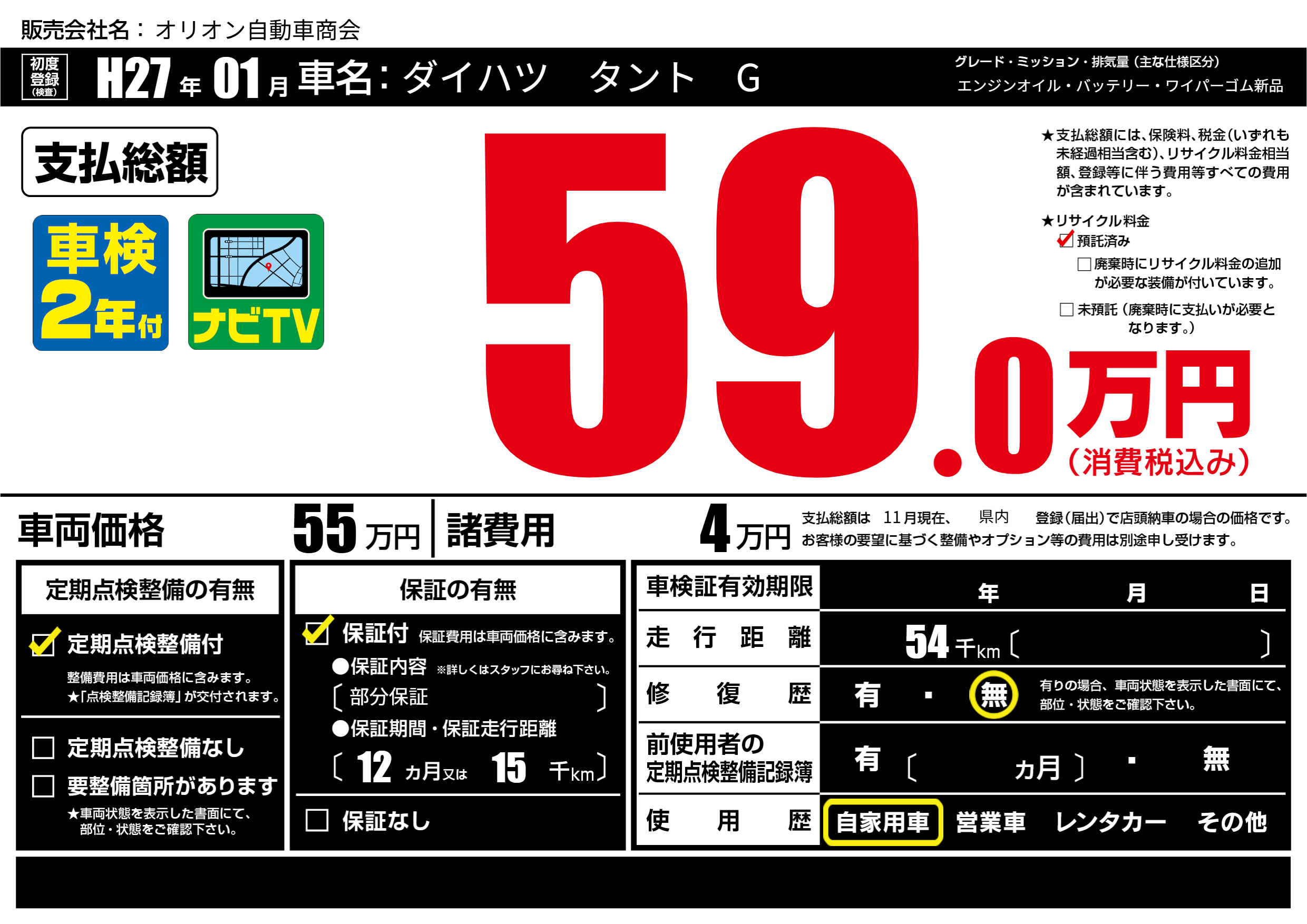 | 車名 | ダイハツ タント G | グレード ミッション 排気量 |