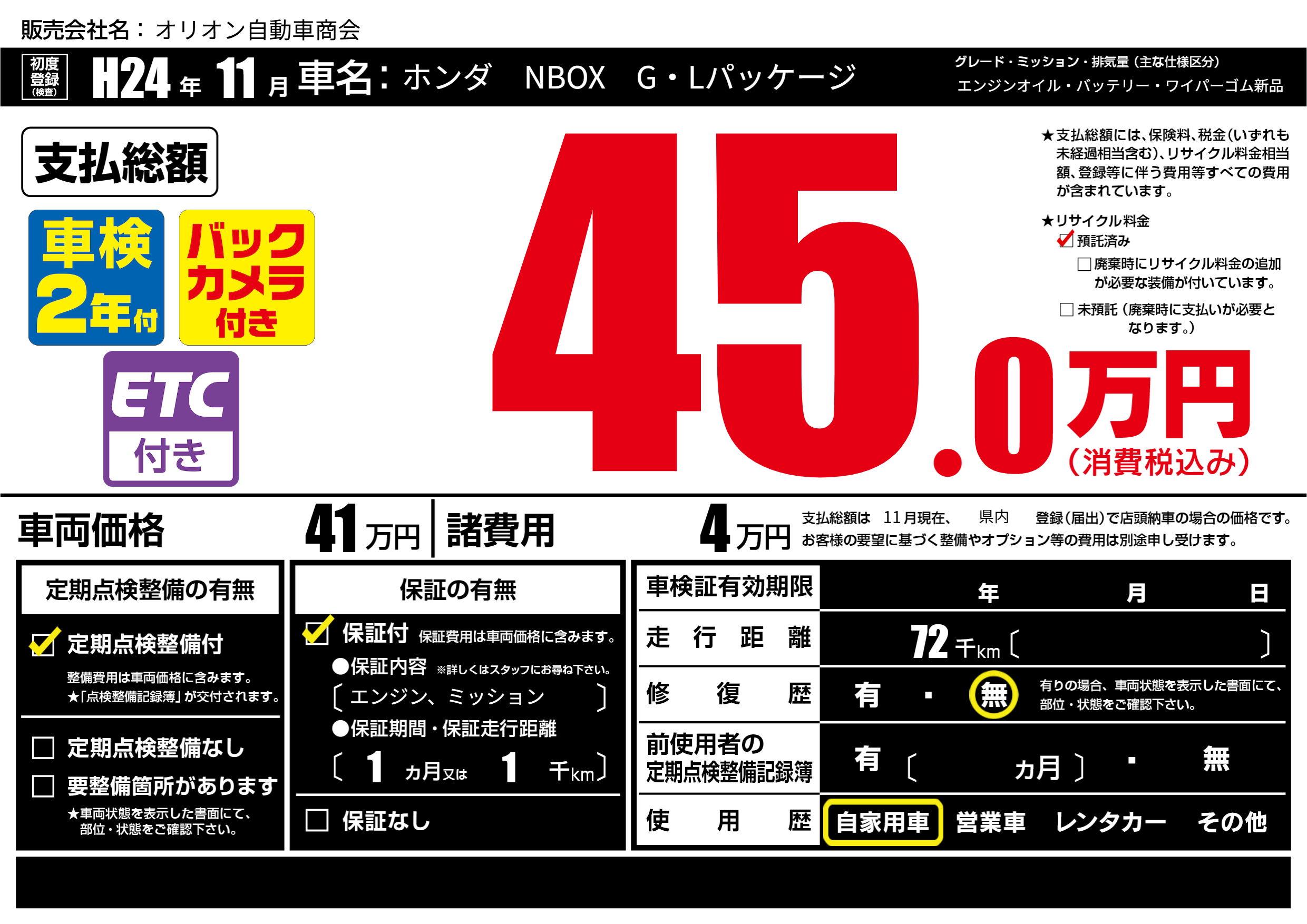 | 車名 | ホンダ NBOX G・Lパッケージ | グレード ミッション 排気量 |