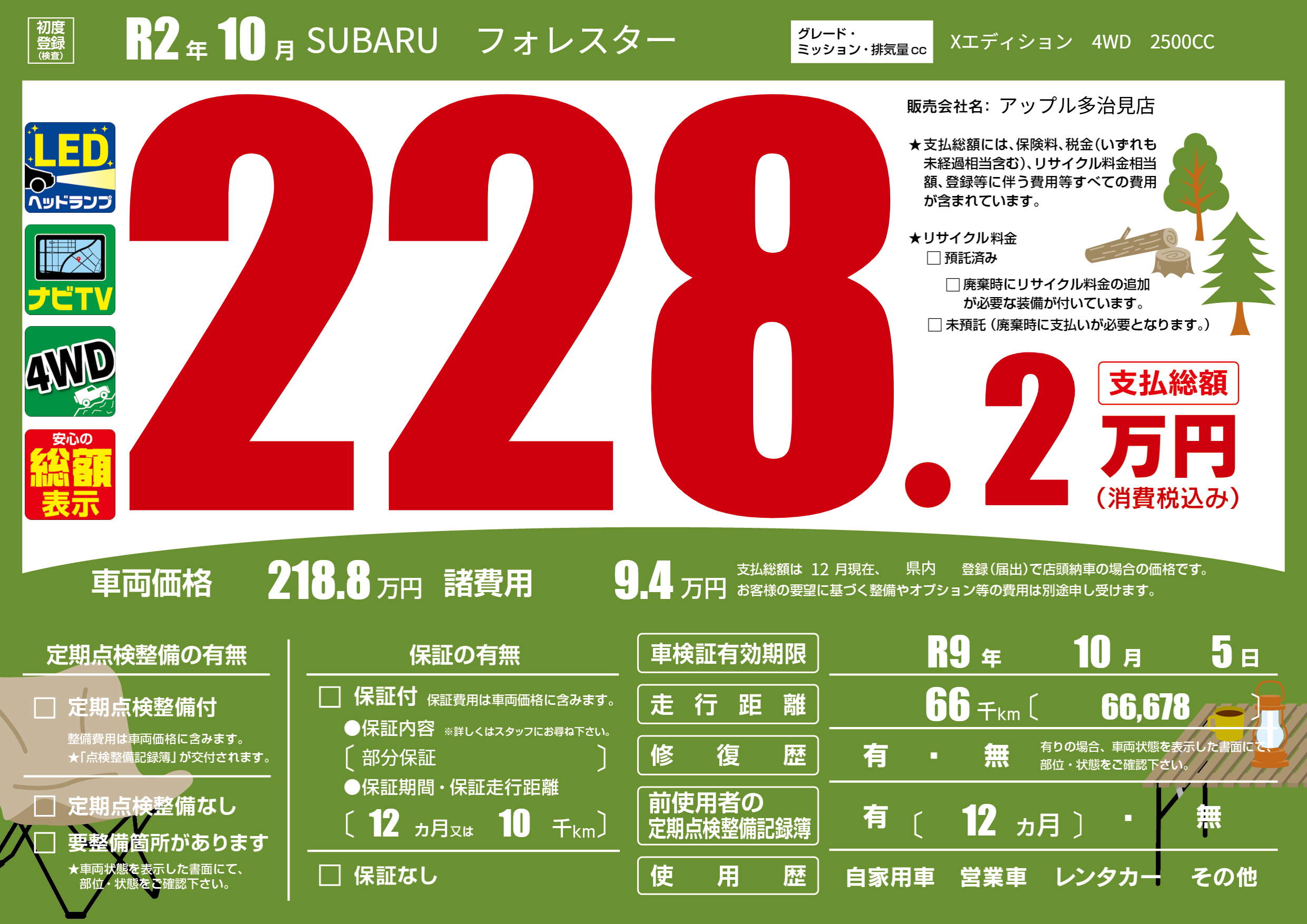 | 車名 | SUBARU フォレスター | グレード ミッション 排気量 |