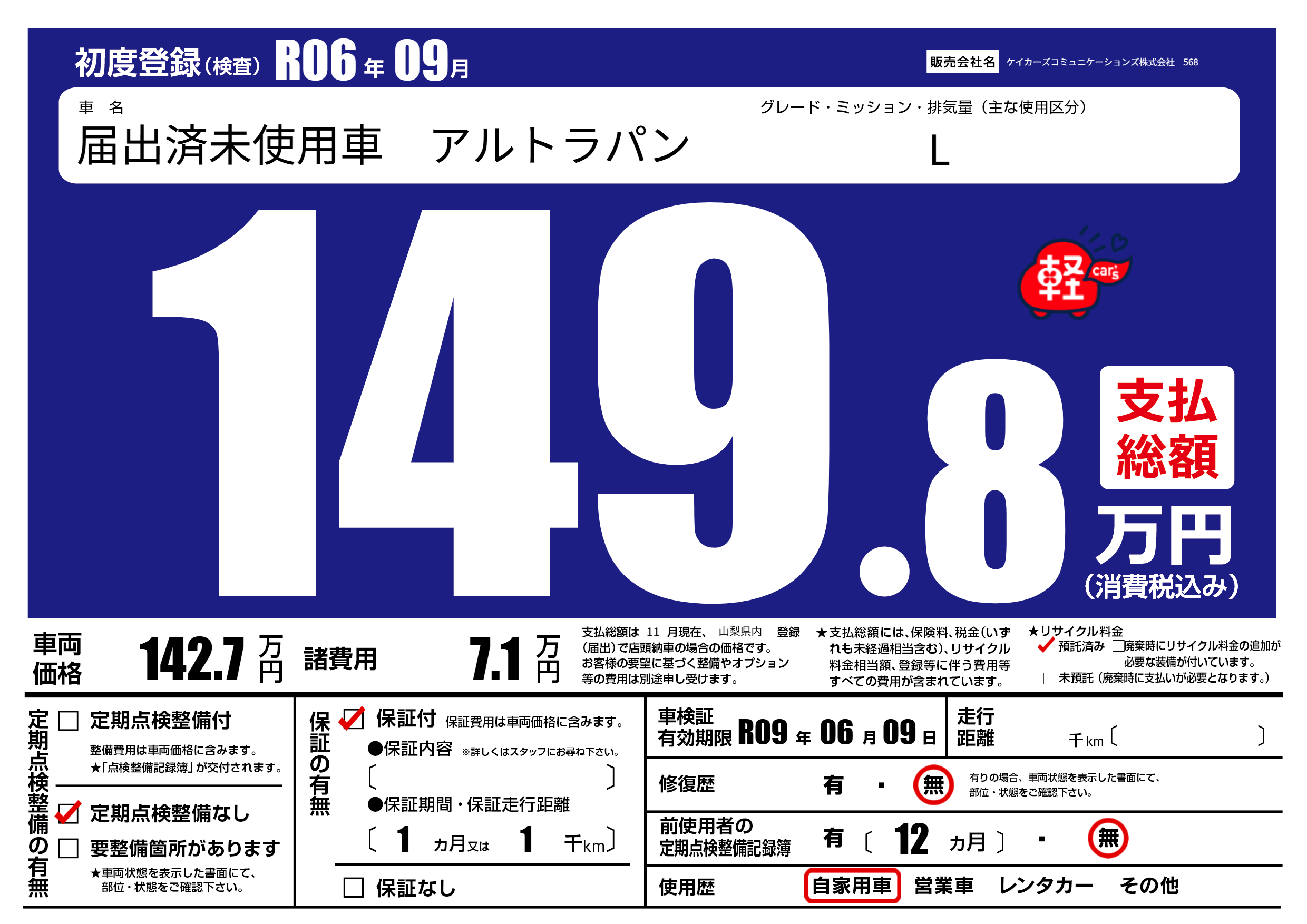 | 走行キロ | - | 初年度登録 | R06年09月 |