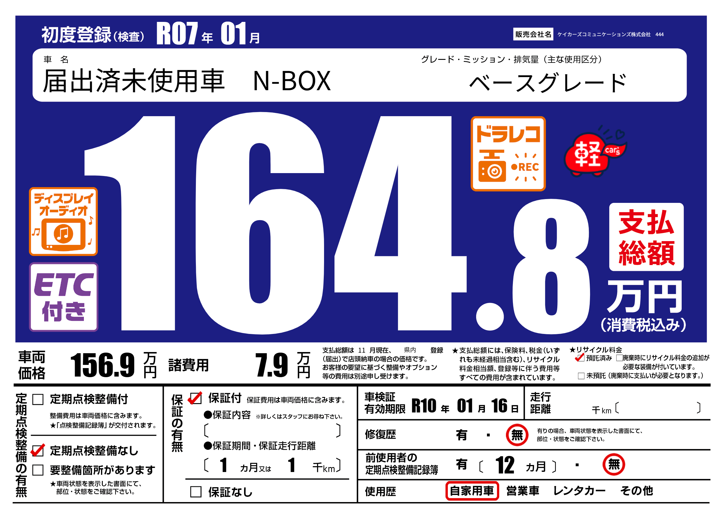 | 走行キロ | - | 初年度登録 | R07年01月 |