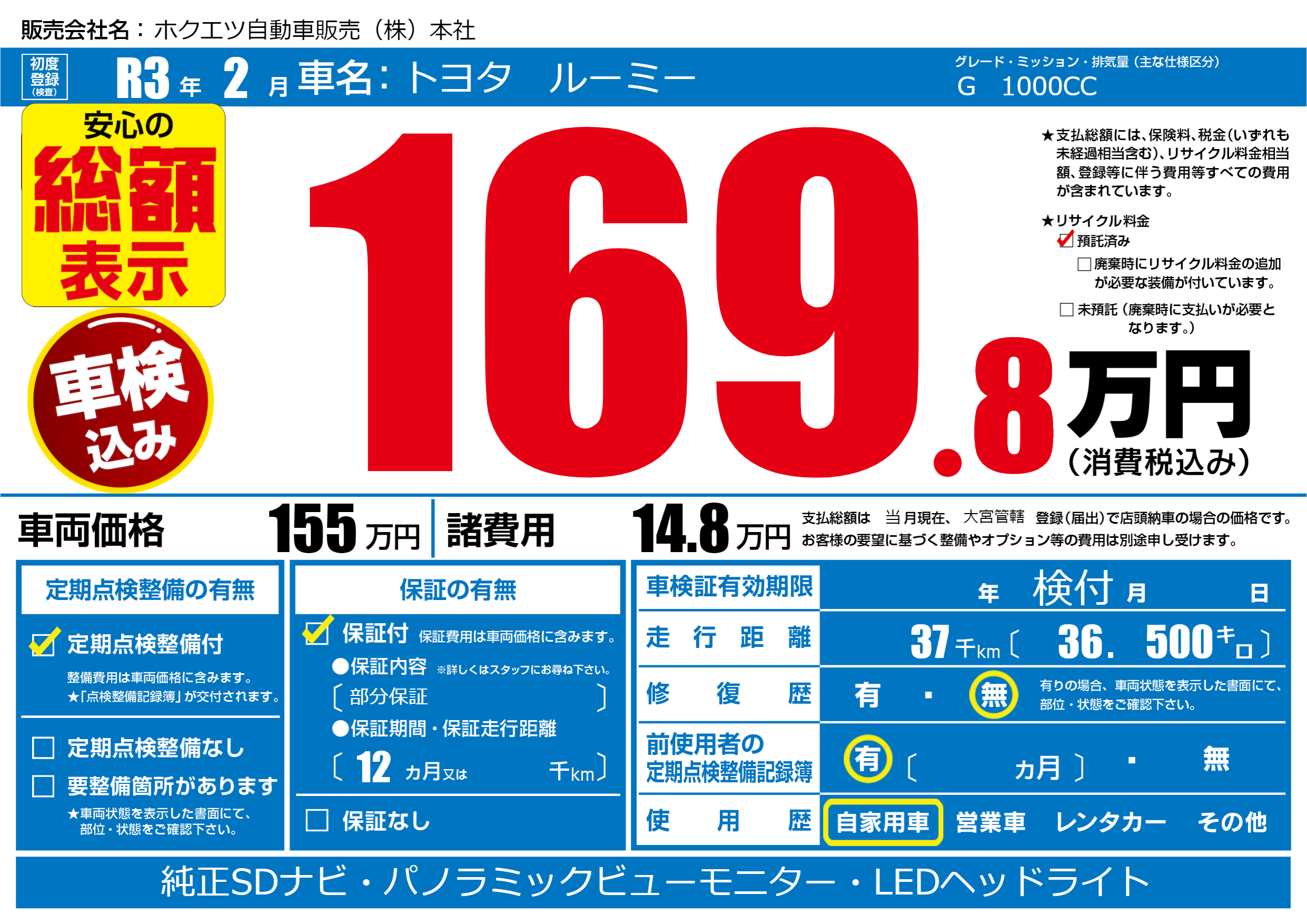 | 車名 | トヨタ ルーミー | グレード ミッション 排気量 |