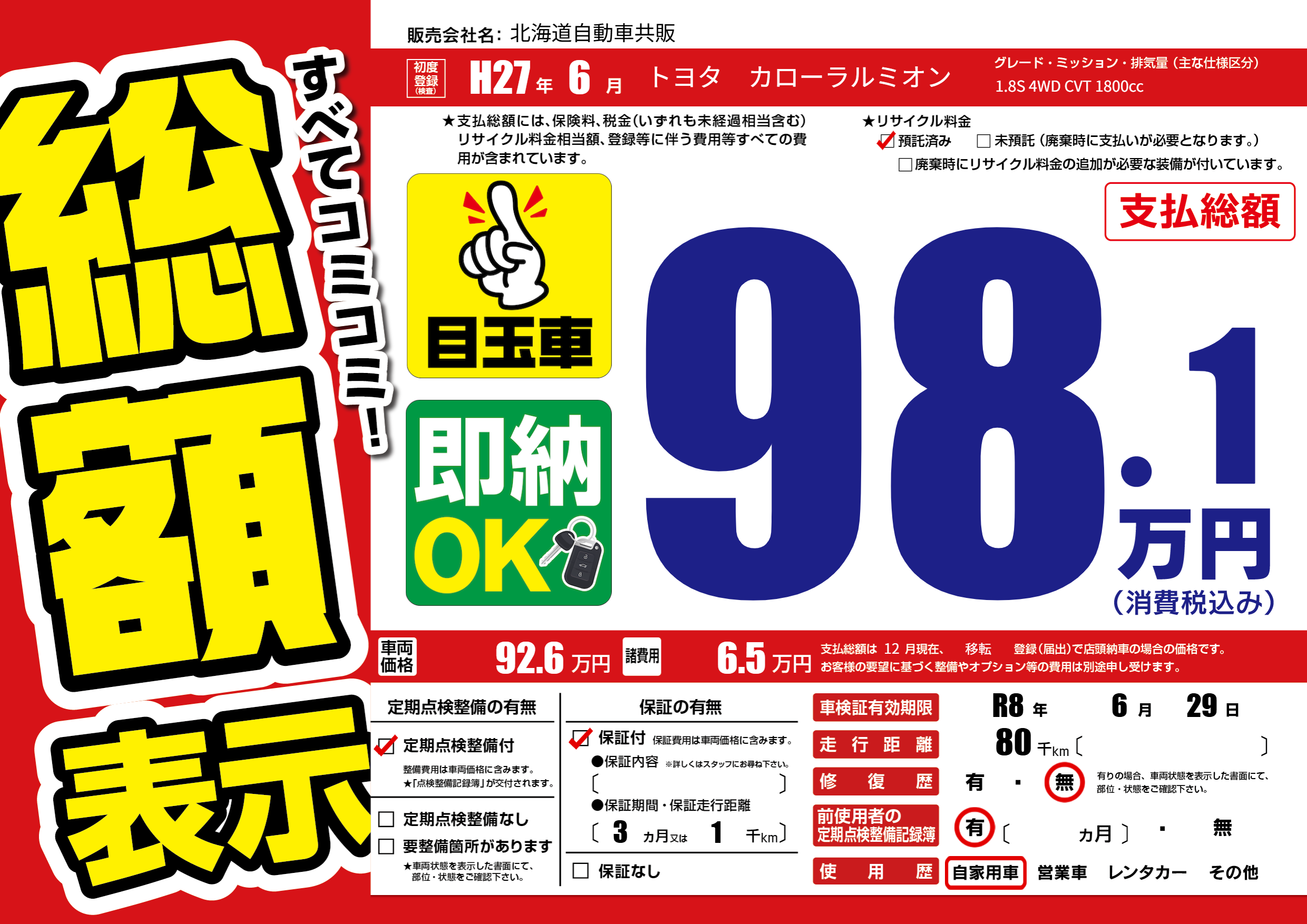 | 走行キロ | 8万km | 初年度登録 | H27年6月 |