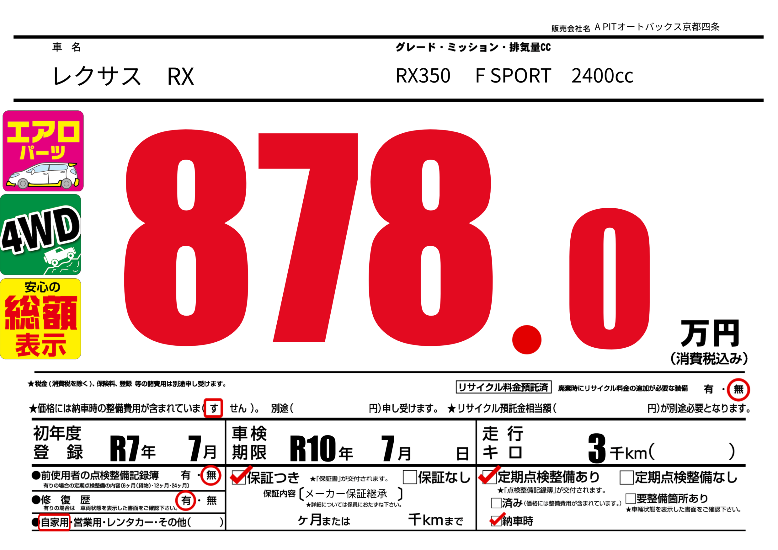 | 車名 | レクサス RX | グレード ミッション 排気量 |