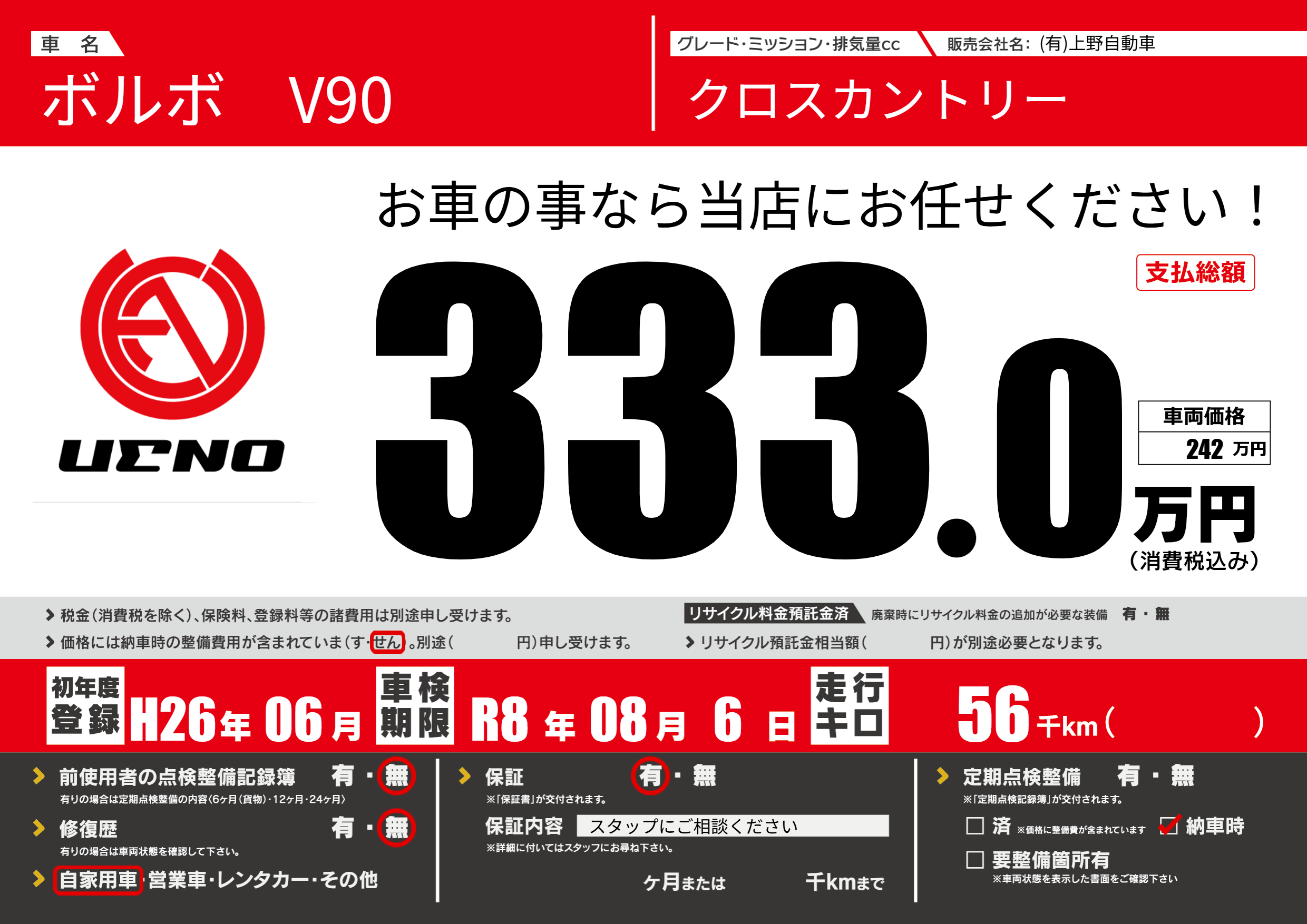 | 車名 | ボルボ V90 | グレード ミッション 排気量 |