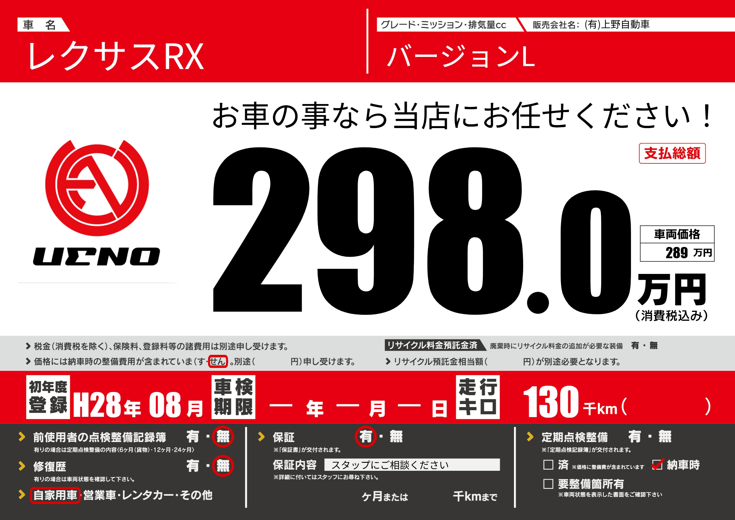 | 車名 | レクサスRX | グレード ミッション 排気量 |