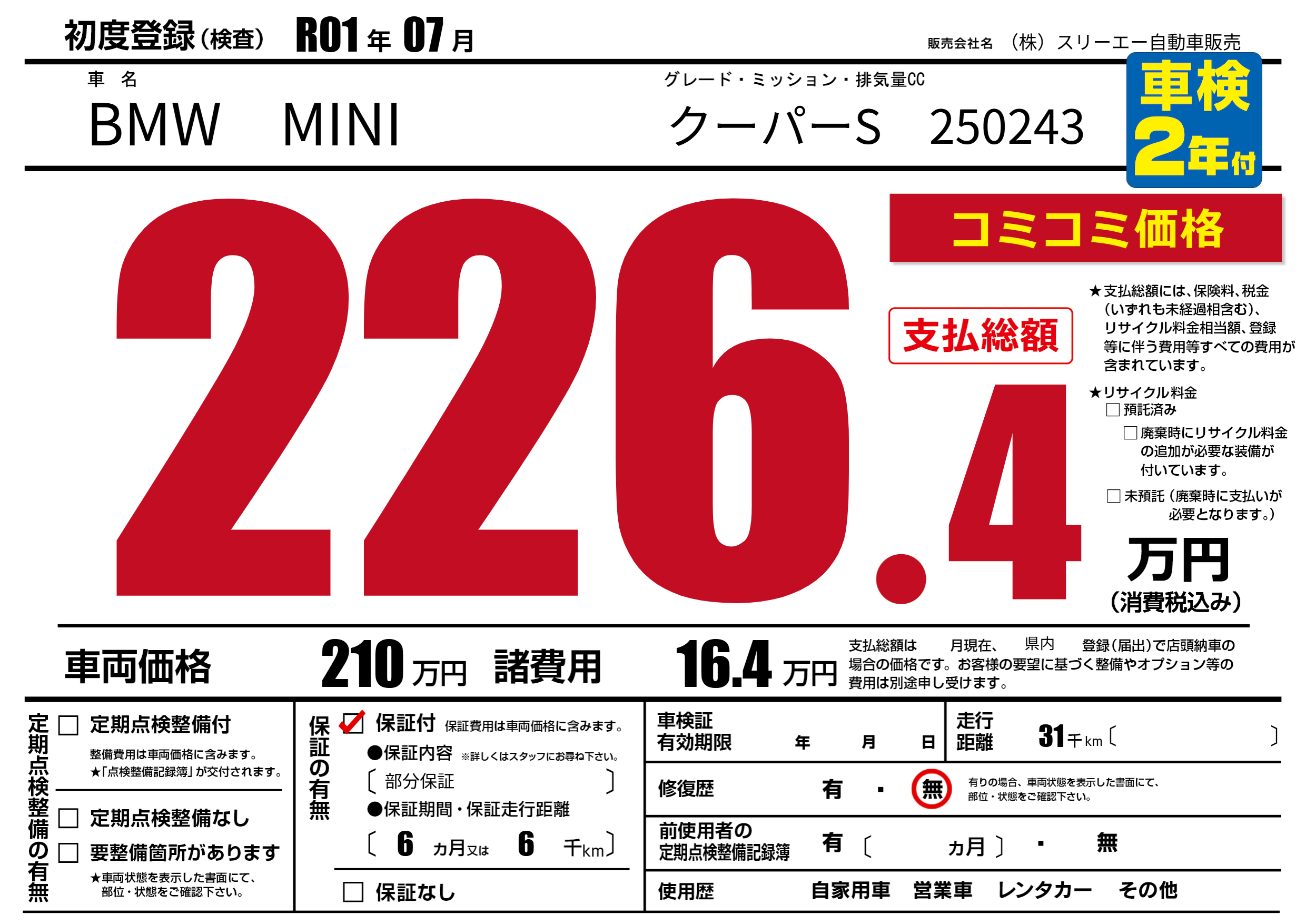 | 車名 | BMW MINI | グレード ミッション 排気量 |