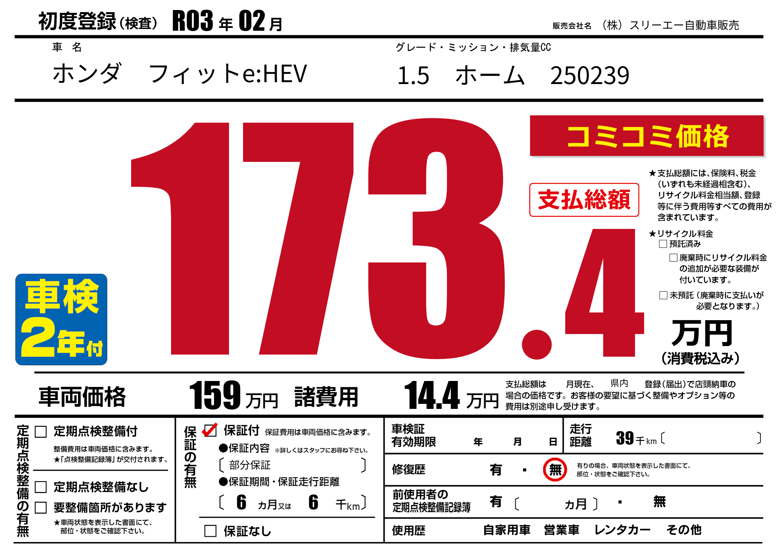 | 走行キロ | 3.9万km | 初年度登録 | R03年02月 |