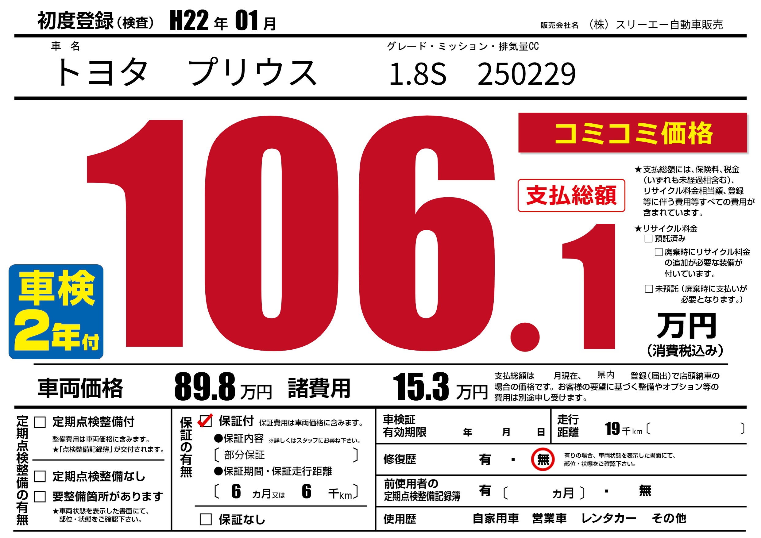 | 車名 | トヨタ プリウス | グレード ミッション 排気量 |