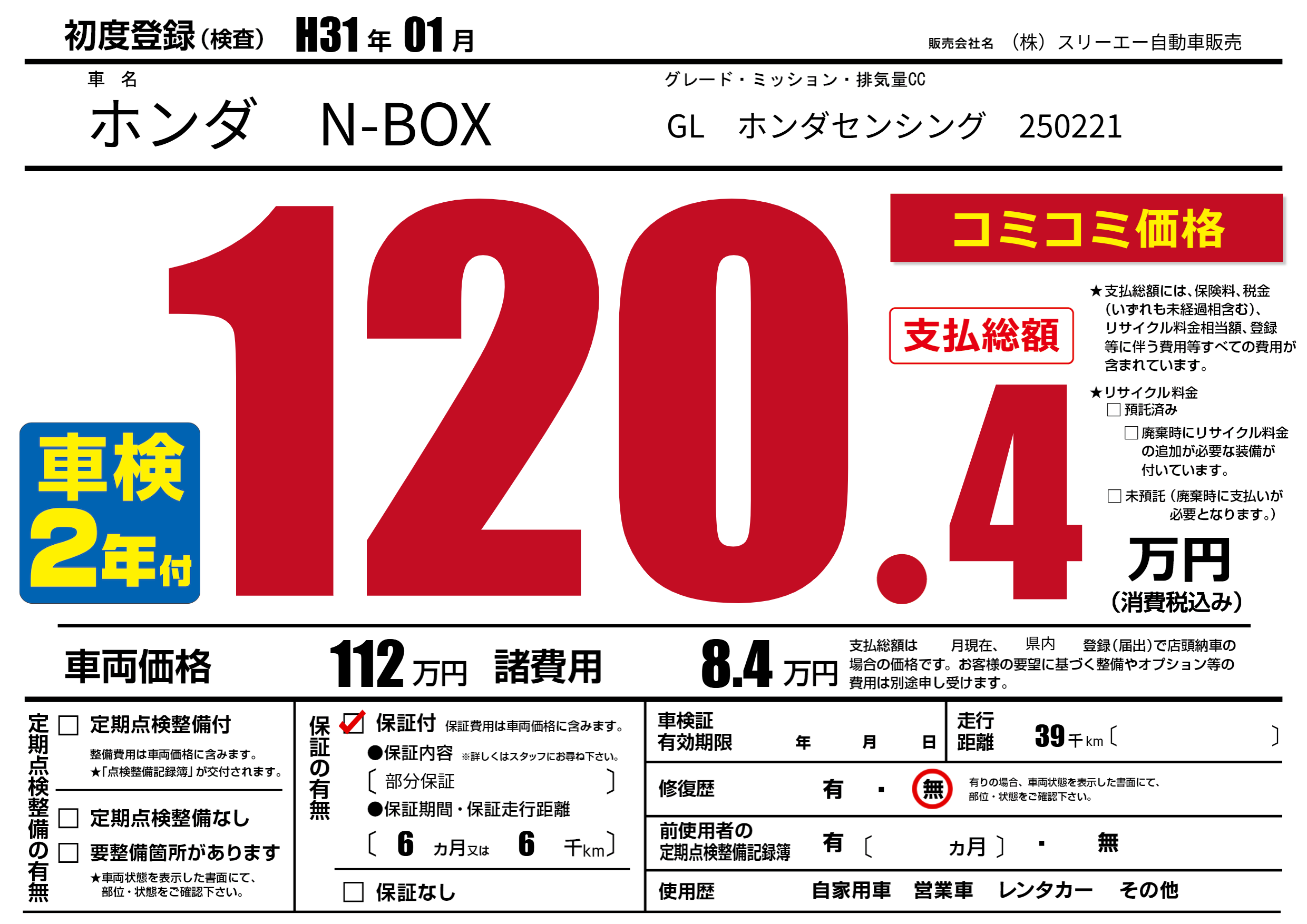 保証付き 保証内容(部分保証) 6ヶ月または(6)千kmまで |