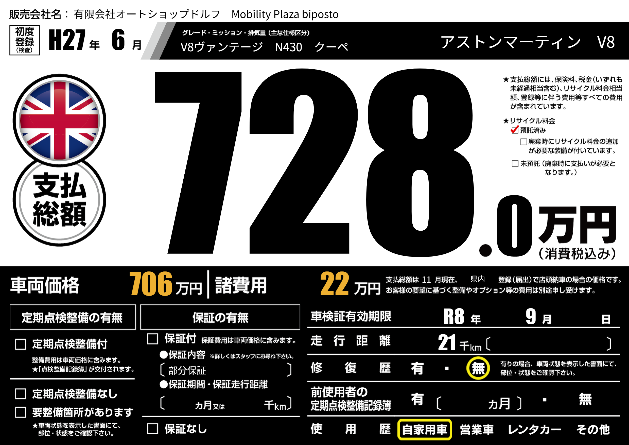 | 車名 | アストンマーティン V8 | グレード ミッション 排気量 |