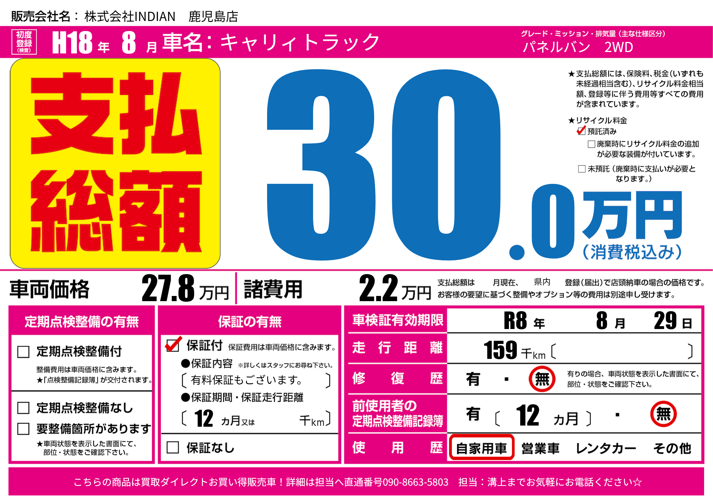 | 走行キロ | 15.9万km | 初年度登録 | H18年8月 |